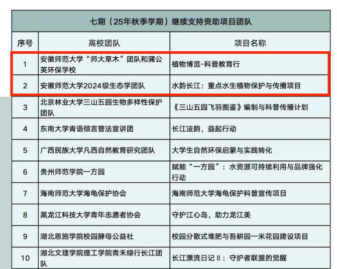 近日,第七期“涓流行动——‘一个长江’大学生环保活动资助计划”名单正式公布,生态与环境学院环境与健康协会、蒲公英环保学校以及2024级生态学专业“水韵长江——重点水生植物保护与传播项目”团队,凭借扎实的前期积累与富有创新性的项目设计,从全国多所高校中脱颖而出,成功获得资助。此次一同入选的还有来自北京大学、复旦大学等高校的共69支团队。截至目前,生态与环境学院已累计五次获得该计划资助,持续展现出生环学子在生态环保领域的专业行动力与社会影响力。