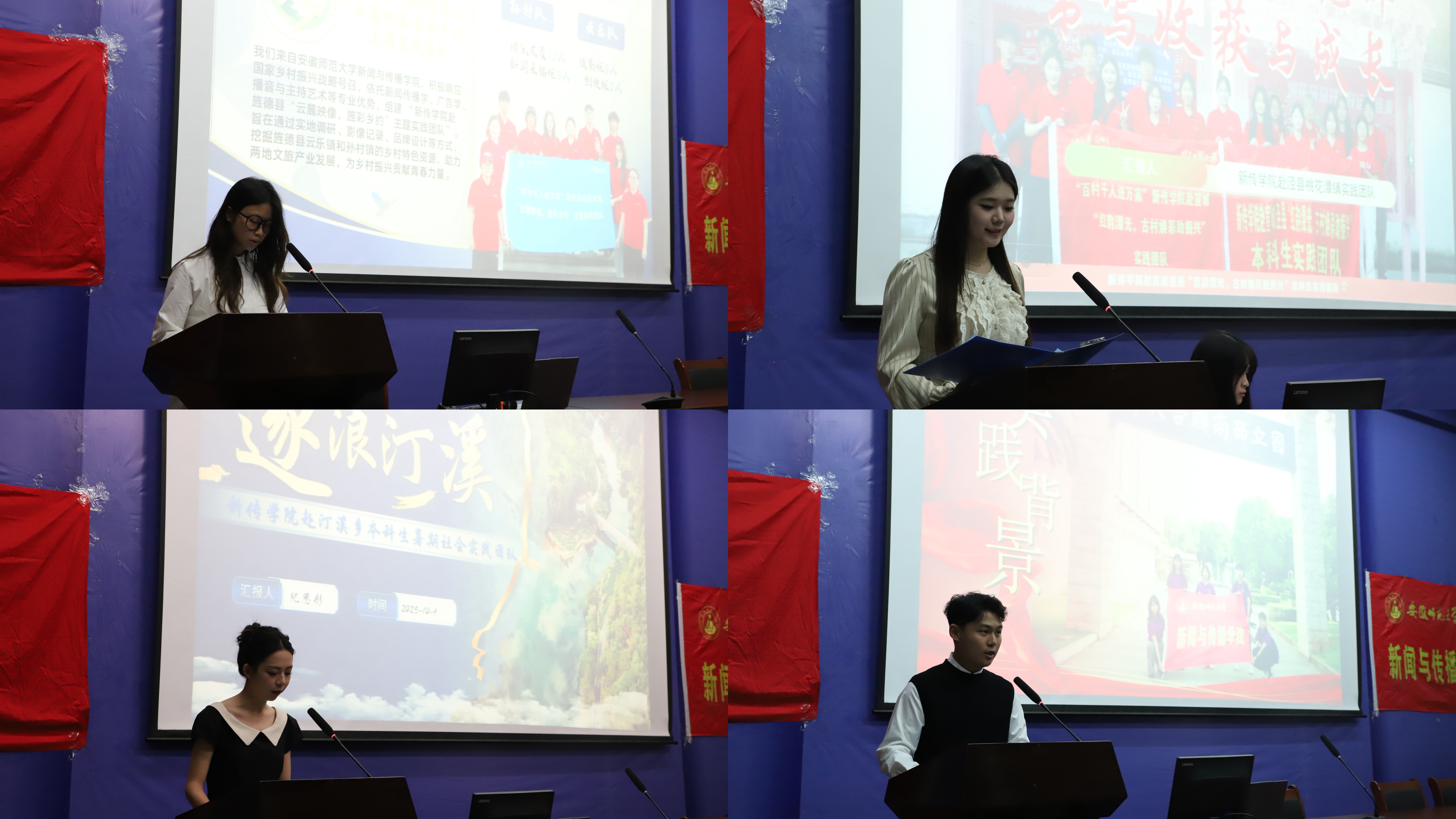 汇报环节,17支实践团队的代表依次登台,以扎实的调研成果和生动的现场讲述,展现了新传学子如何将专业所学,转化为服务地方发展的实际行动。赴云南“重走联大路,续写强国梦”团队,用“风物云南”“走读云南”系列专题报道,深度挖掘当地人文非遗,以青年视角叙写新时代的强国故事。赴泾县桃花潭镇“红韵潭光,古村焕彩助振兴”团队深入田间地头,运用深度访谈与纪实手法,寻访废弃校舍改建民宿的创业历程,为乡村文旅发展注入新传智慧。赴旌德县“云麓映像,旌彩乡约”团队则聚焦人物,走访了13位产业带头人、基层干部与退伍老兵,用笔和镜头记录下当地的红色传承与产业多样化探索。赴泾县“泾彩寻迹,光影琴溪”社会实践团队充分发挥专业优势,摄制文旅宣传片让琴溪“被看见”,设计系列文创产品让风景“可带走”,并通过采写当地村民与创业者的故事,让乡村的独特魅力“被向往”……
