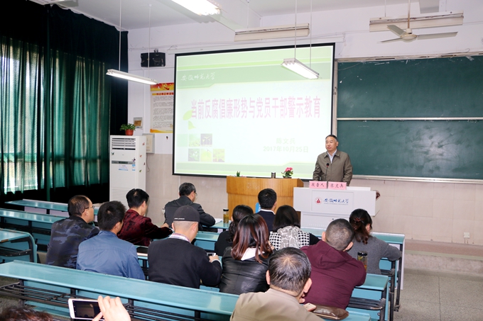 本网讯(文/叶建图/赵栋)1025日下午,后勤党委组织全体党员以及科室中心副主任以上管理人员开展“增强定力,永葆清廉”主题教育活动。邀请校纪委副书记、监察处处长陈文兵作了题为《当前反腐形势与党员干部警示教育》的专题报告。报告会由后勤党委书记孔德新主持。