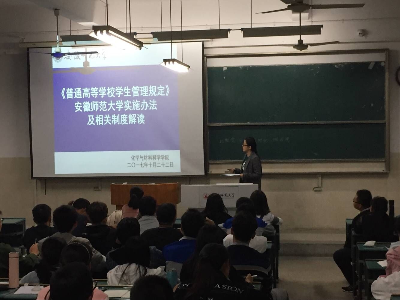 各年级辅导员通过召开主题班会的形式,及时将《普通高等学校学生管理规定》、安徽师范大学实施办法及相关制度传递给学生。为了深化学生的认识,学工队伍特地将全新的管理制度与以往的管理制度进行比较,突出变化的重点内容,帮助学生明确新方法、新要求、新规定。