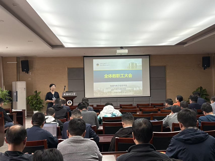 近日,物电学院在物理楼304会议室召开全体教职工大会,开展相关理论政策学习,总结前期工作,布置近期重点工作。学院全体教职工参加会议,会议由学院党委书记宋静主持。