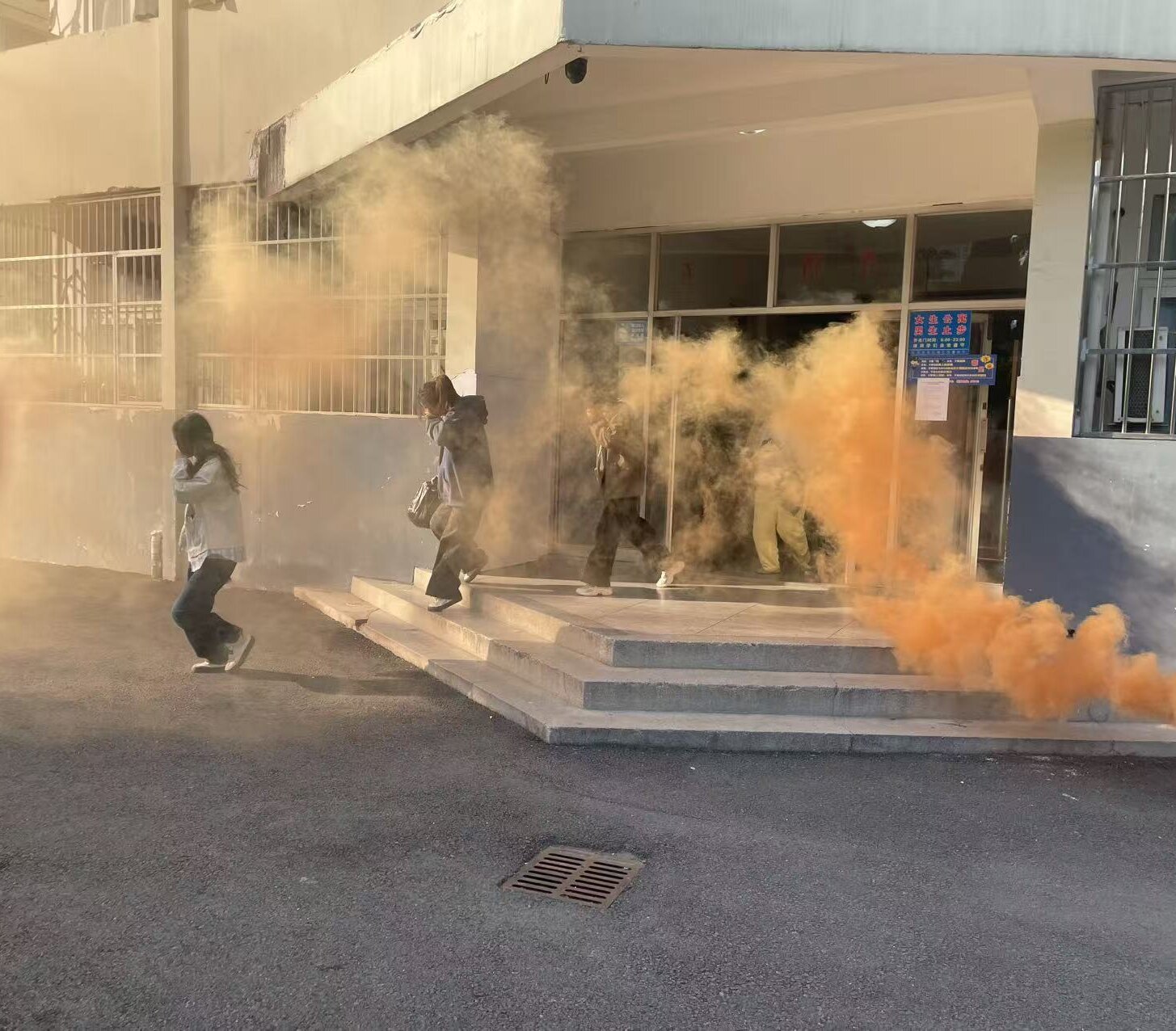 防震避险环节结束后,消防疏散警报随即响起。在工作人员的引导下,全体学生用湿毛巾捂住口鼻,弯腰低姿,沿着既定疏散路线快速有序前行。疏散过程中,大家自觉保持间距,避开拥挤路段,严格听从现场指挥,仅用时5分钟便全部安全撤离至校园指定集结点。工作人员迅速清点人数,确认无遗漏后及时上报,整个疏散流程衔接顺畅、高效规范。
