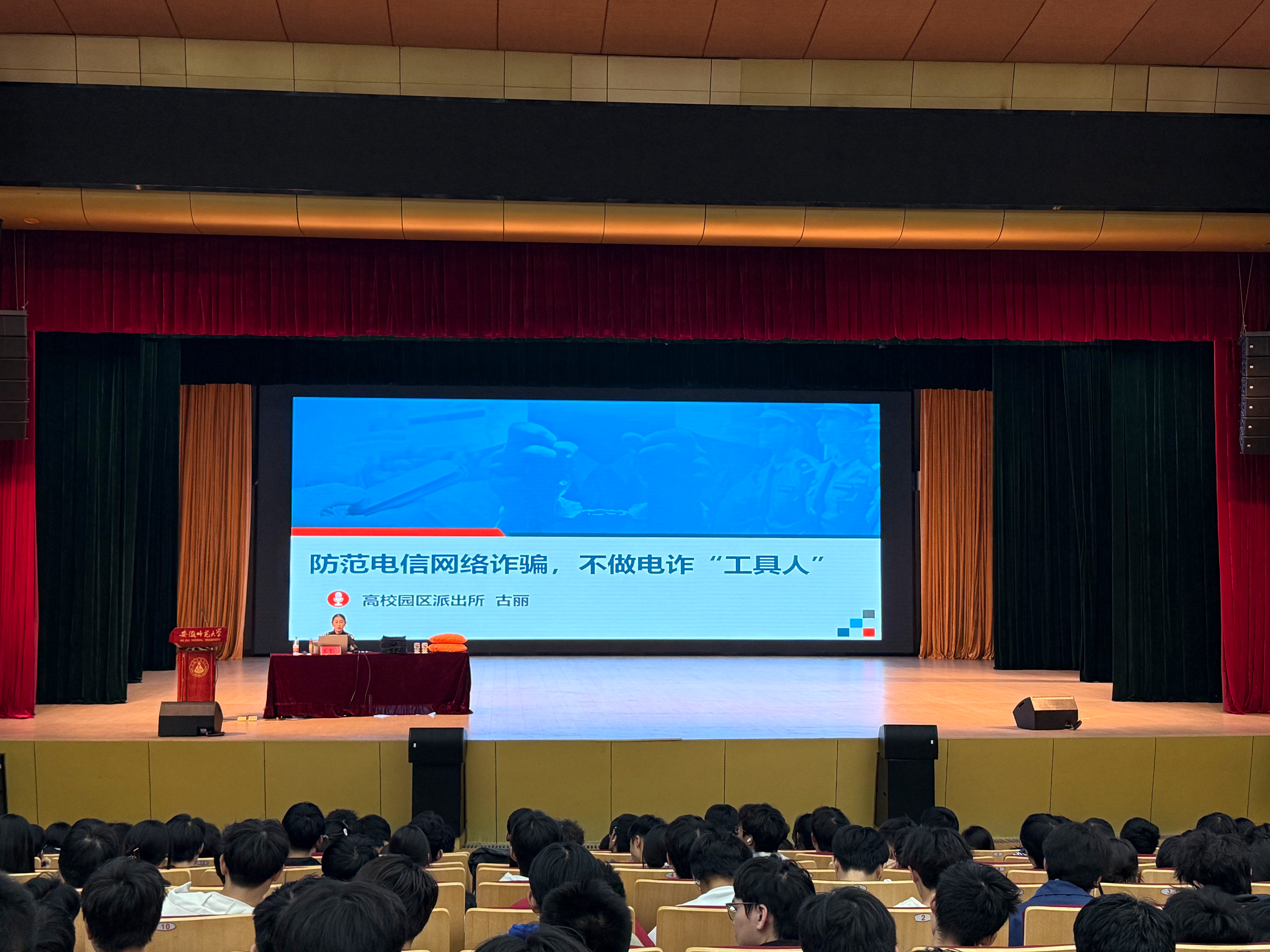 为进一步增强大学生防范电信网络诈骗的意识和能力,切实保障学生财产安全,11月5日,计信学院特邀高校园区派出所古丽警官,面向2025级全体新生、高年级班干及寝室长开展了一场主题为“防范电信网络诈骗,不做电诈‘工具人’”的反诈骗宣传讲座。活动在花津大礼堂举行,讲座由2025级辅导员姚良飞主持,现场气氛热烈,学生反响积极。