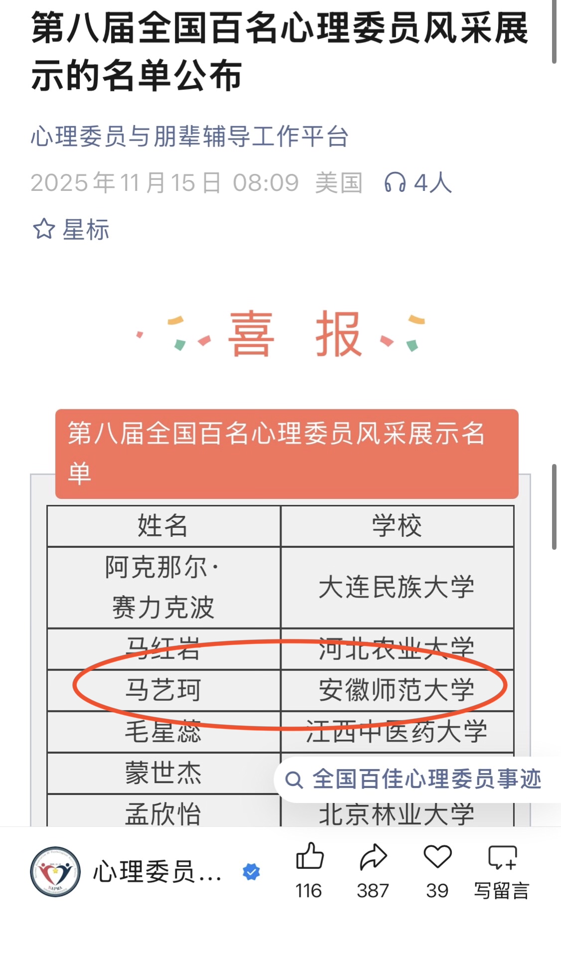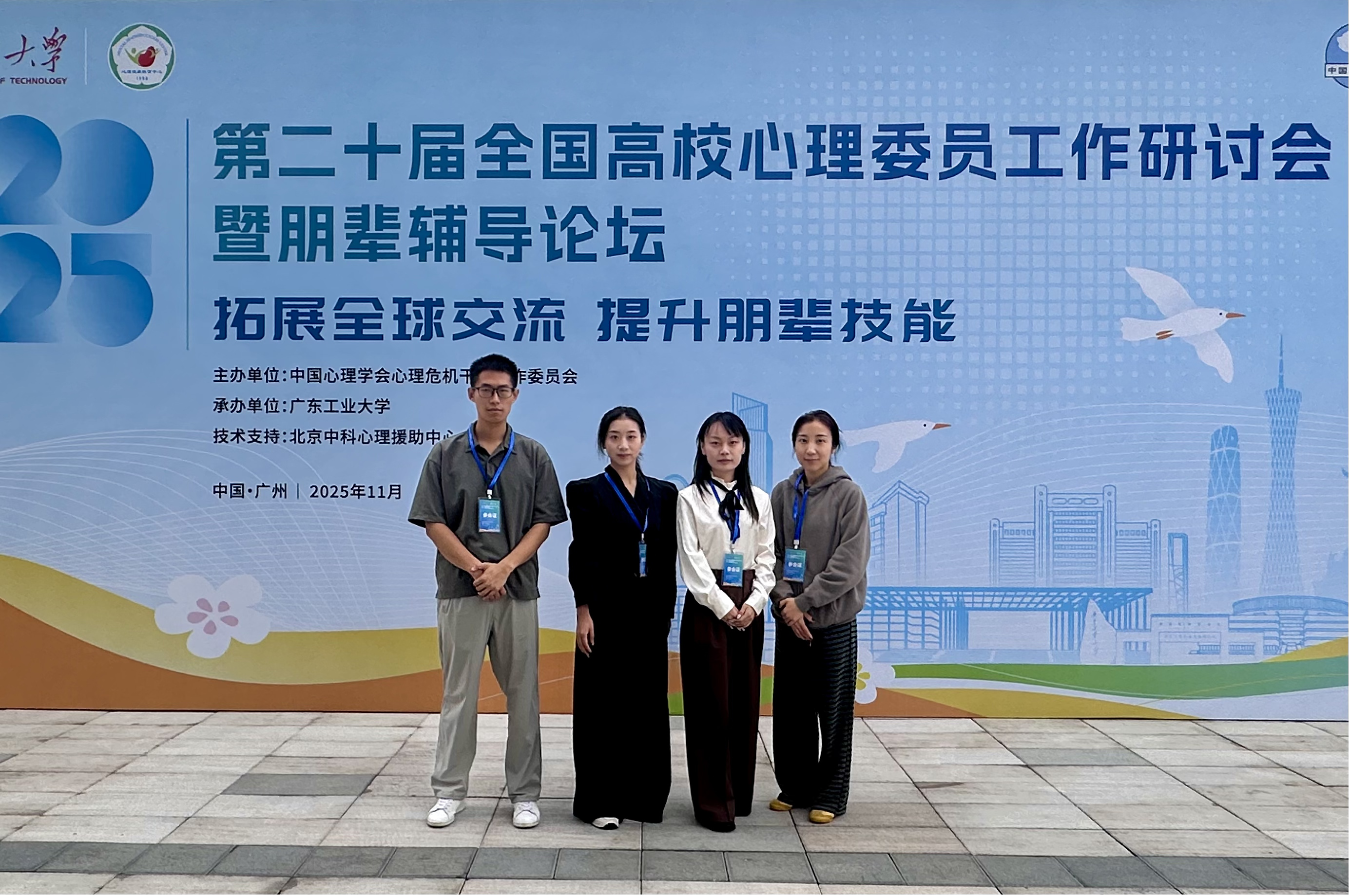2025年11月4日至7日,第二十届全国高校心理委员工作研讨会暨朋辈心理辅导论坛在广东工业大学成功举办。我校“十佳优秀心理委员”、音乐学院2023级舞蹈表演专业马艺珂与教育科学学院程悦作为安徽师范大学代表参会,并双双荣获“全国百佳心理委员”称号。本次会议由中国心理学会心理危机干预工作委员会与全国高校心理委员研究协作组共同主办,汇聚了国内外心理健康领域的专家学者及全国数百所高校师生代表。
