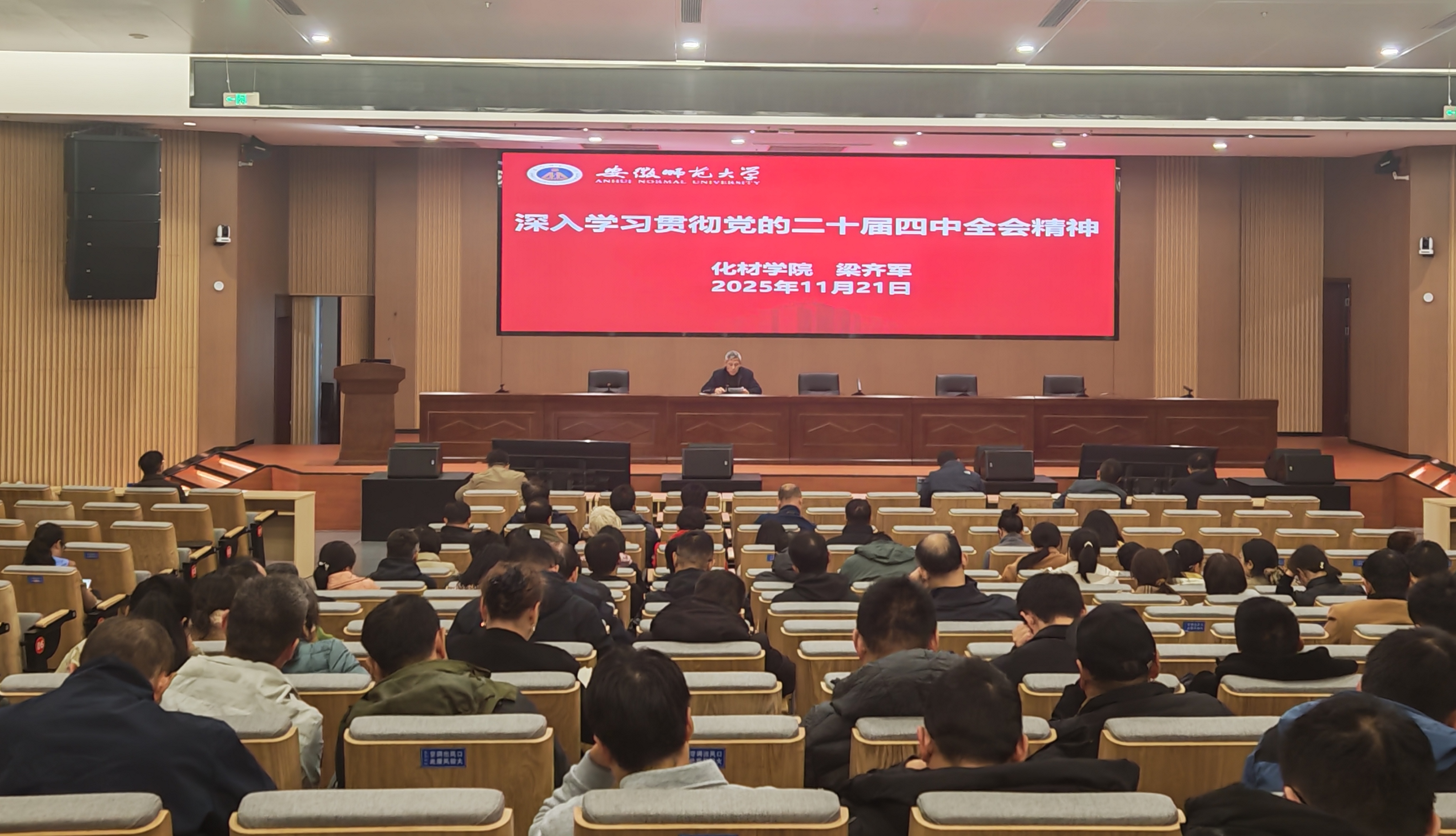 11月21日下午,化材学院在文典楼西(侧)裙3楼报告厅召开全体教职工大会,集中传达学习党的二十届四中全会精神,开展实验室安全和师德师风专题教育,全体教职工参加会议,院党委书记梁齐军主持会议。