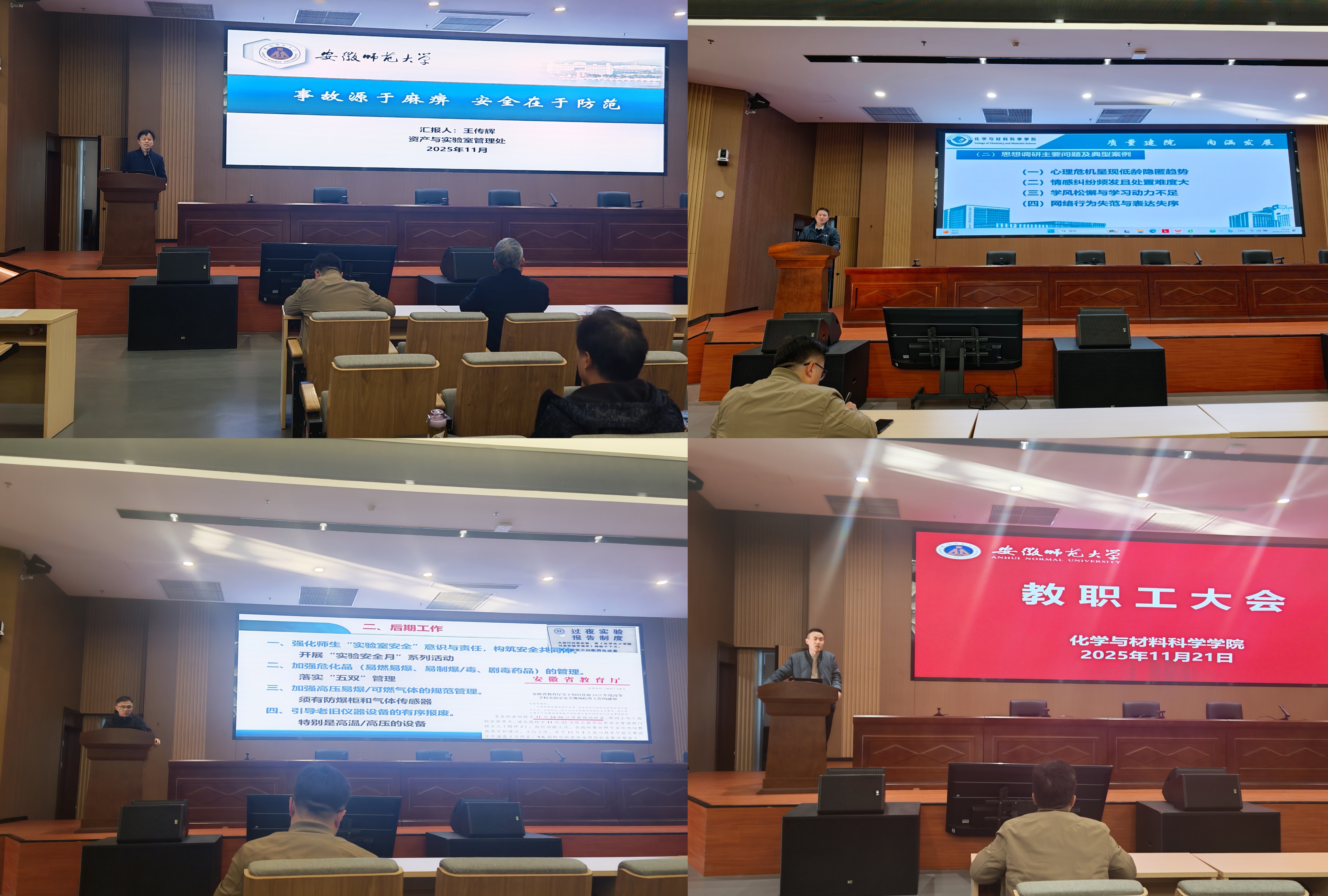 会上,还邀请了校资产与实验室管理处处长王传辉就加强实验室安全作了专题教育,他通过丰富真实的案例、详实精准的数据深刻说明实验室是教学科研的重要场所,安全工作是重中之重,希望学院全体教职工不断增强安全意识,细化落实各项安全措施,切实保障实验室安全运行。学院党委副书记、纪委书记芮先红通报多起教师师德失范警示教育案例,开展师德师风专题教育,强调全体教职工要以案为鉴,进一步增强教师的责任感、使命感、荣誉感,规范职业行为,明确师德底线。副院长陈郑就科研工作和研究生教育管理做了布置。副院长周映华重点通报了秋季学期以来学院实验室安全管理的整体情况。