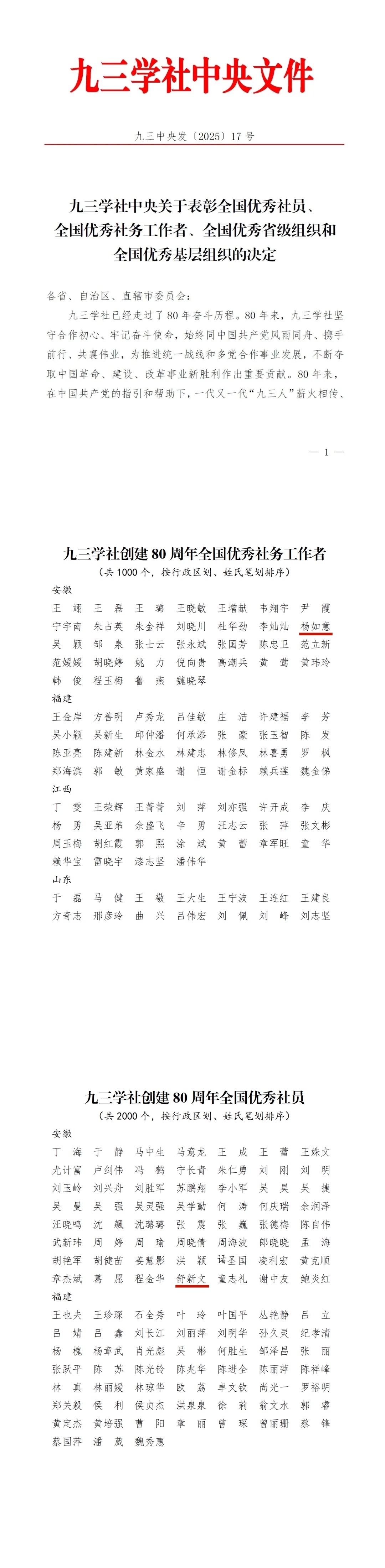 近日,九三学社中央印发《九三学社中央关于表彰全国优秀社员、全国优秀社务工作者、全国优秀省级组织和全国优秀基层组织的决定》(九三中央发〔2025〕17号),对在各项工作中取得突出成绩的组织和个人进行表彰。我校杨如意、舒新文两名社员喜获殊荣,展现了安徽师范大学民主党派成员良好的精神风貌和卓越贡献。