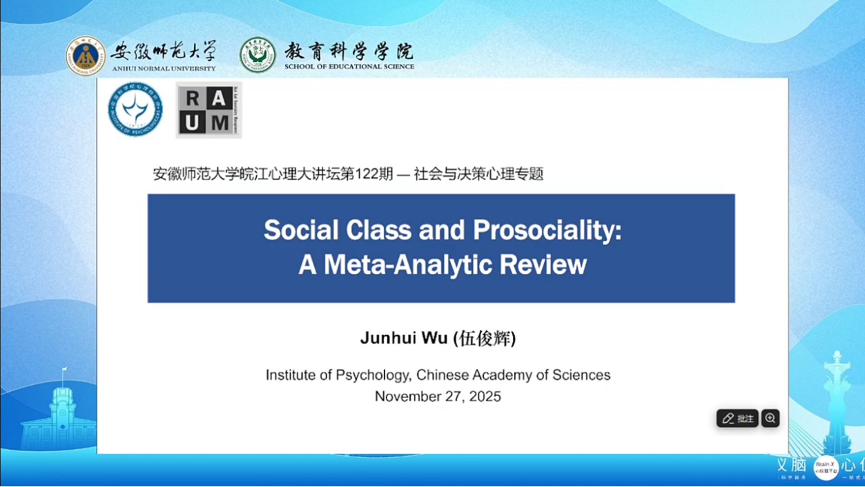 由教育科学学院主办的“皖江心理大讲坛”第122期于11月27日晚间在线举行,中科院心理研究所伍俊辉副研究员和华东师范大学陆静怡教授分别做了主题演讲,中科院心理研究所栾胜华研究员和华东师范大学刘永芳教授进行了精彩点评。本次讲座由教育科学学院汪祚军教授主持,教育科学学院副院长韩建涛教授代表主办单位致辞,心理学系师生全程聆听学习,本次讲座通过网络直播的方式进行,校内外在线听众超过2000人次。