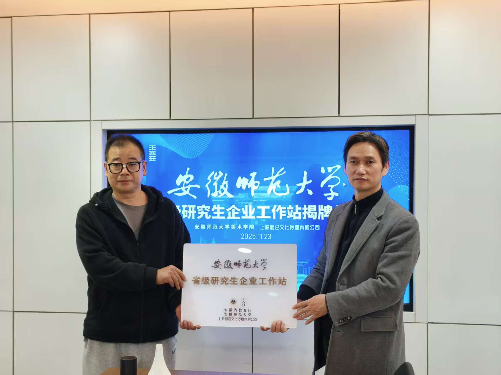座谈会后,学院与上海道合文化传播有限公司联合举行省级研究生企业工作站揭牌仪式。该工作站采用“双导师制”,由校内导师与企业资深设计师共同指导,依托真实商业项目为研究生提供沉浸式实践机会,涵盖品牌设计、艺术策展等实务训练,打通“课堂到职场”衔接通道,实现校企资源共享、人才共育。期间,学院实地考察企业工作环境与项目运作流程,与两地实习就业的往届研究生亲切交流,倾听其职业发展心得与建议,鼓励毕业生扎根岗位、深耕行业。