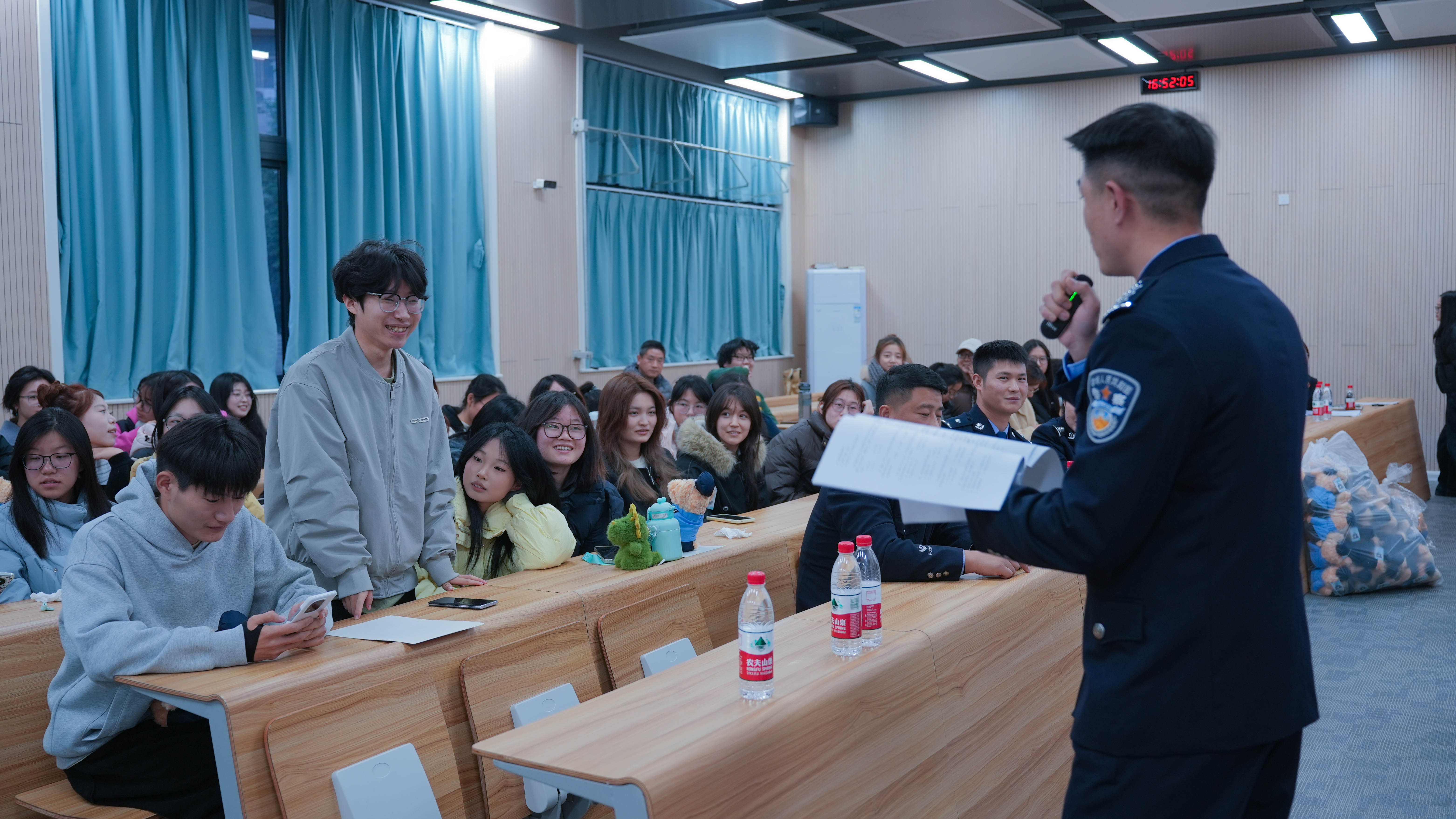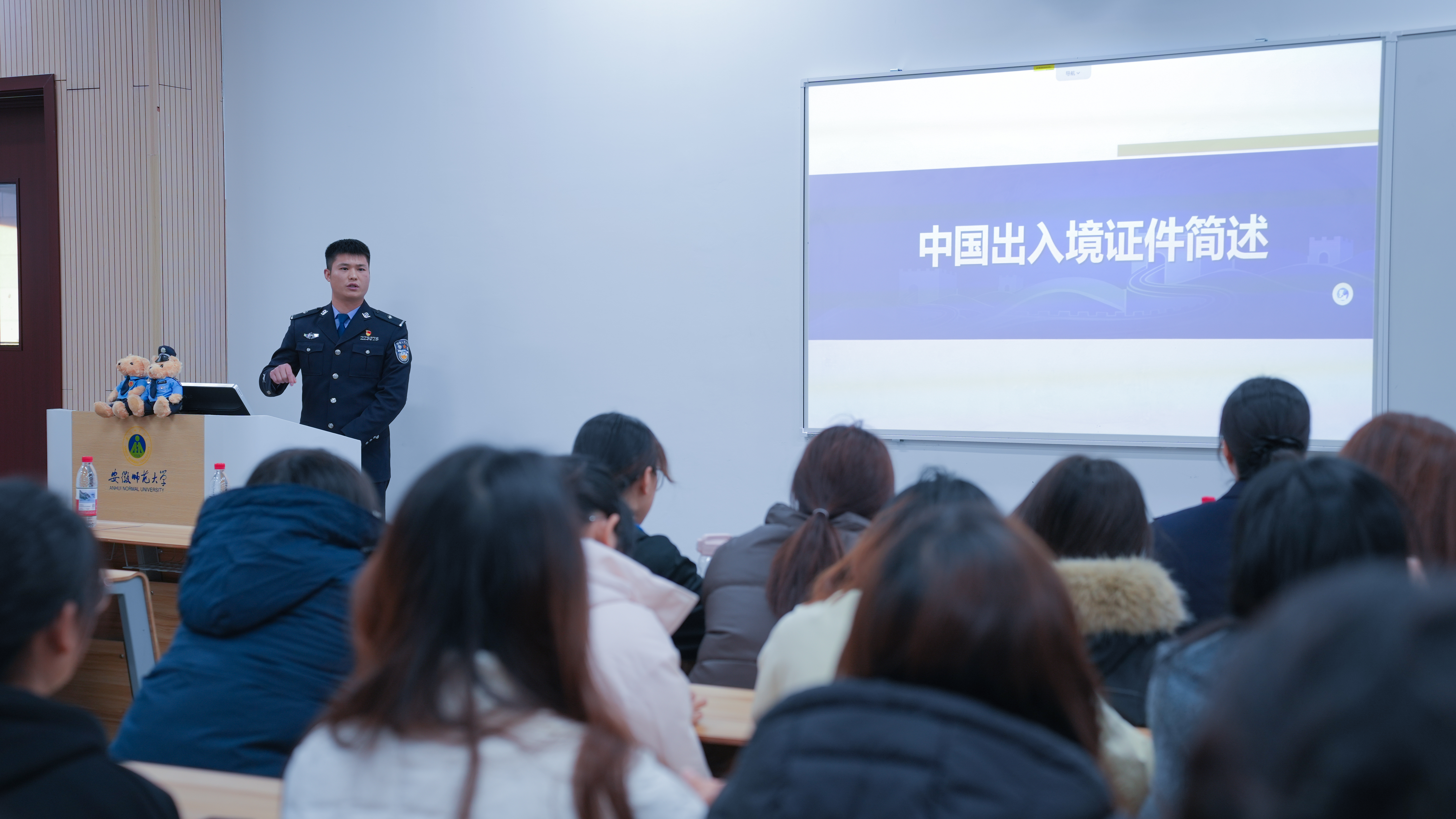 紧接着,芜湖出入境边防检查站执勤一队二级警长李昂以“图文结合”的方式详细讲解了出入境证件的申领流程和使用场景,针对性地解读了《出入境管理法》中与同学们息息相关的法律规定,帮助同学们提前规避出行风险,对“国门法治”形成直观且深刻的认知。最后,活动在“法律知识快问快答”的问答游戏中完美落幕。