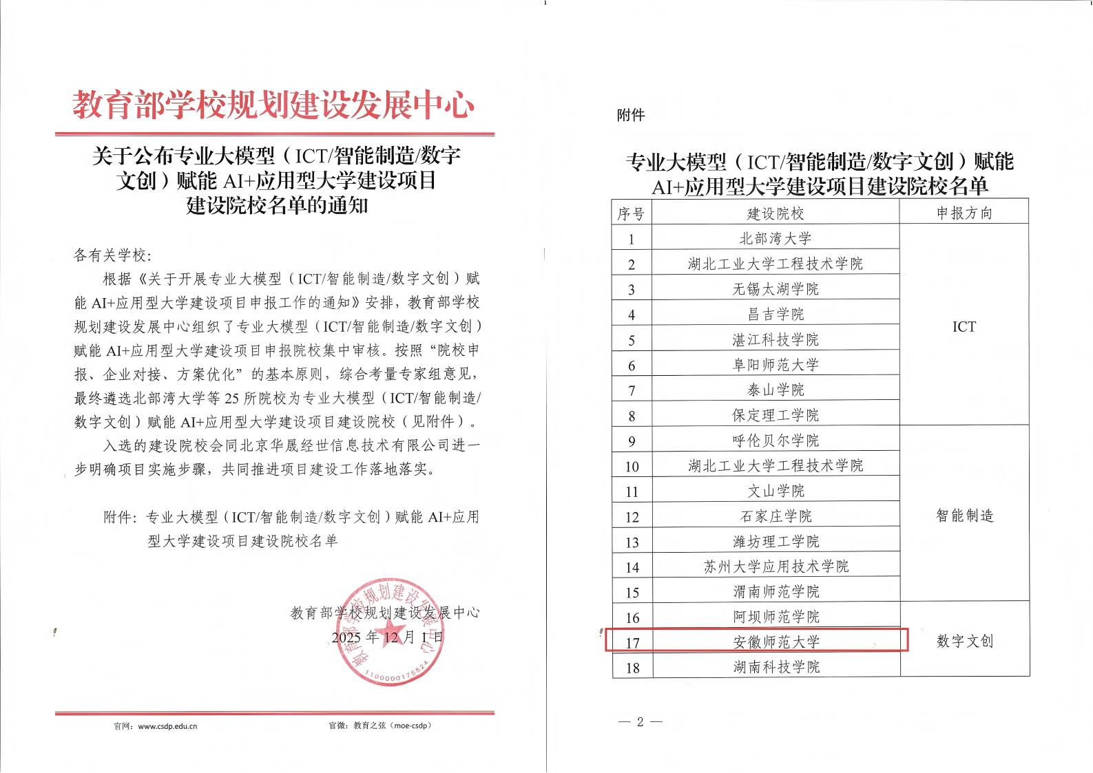 这次入选不仅是学校“AI+教育”战略推进的标志性进展,也为新闻传播学等相关学科的创新发展注入了强大动能。安徽师范大学新闻与传播学院将按照教育部要求,与项目实施企业紧密协作,明确项目实施路径,在数字文创等方向重点发力,共同推进项目建设落地见效。