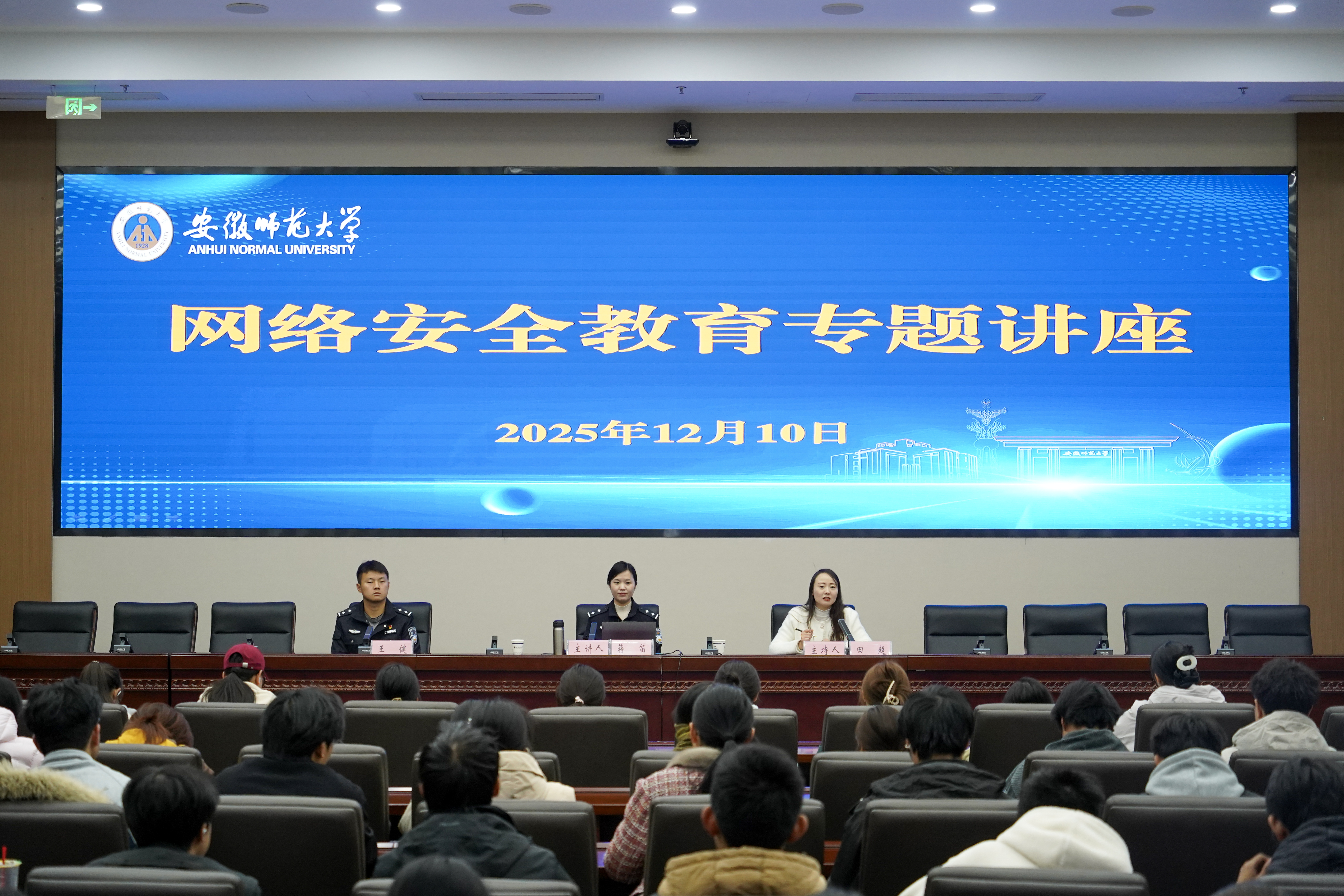 为强化师生网络风险防范能力,筑牢校园网络安全屏障,营造健康清朗、积极向上的校园网络生态,12月10日下午,学校举办网络安全教育专题讲座,邀请芜湖市弋江分局网安大队大队长蒋笛、弋江分局网安大队民警王健来校主讲。党委宣传部副部长田超主持讲座,各学院学生代表参加讲座。