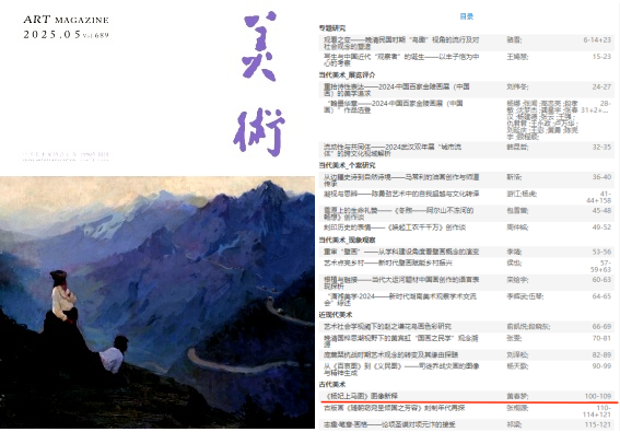 宛俊勇教授《传统文脉与全球视野——新时代综合材料绘画创作的文化探求》(《美术》2025年第3期),探讨了中国综合材料绘画文化主体性的建构问题,其研究立足文化自觉,为本土绘画的当代发展提供了重要的理论支撑。谭小飞副教授《20世纪上半叶“图案”在中国的流传新考》(《装饰》2025年第7期),采用历史研究方法,对20世纪上半叶“图案”概念在中国的流传进行再考察,对设计概念史研究具有补充与修正意义。黄春梦博士《〈杨妃上马图〉图像新释》(《美术》2025年第5期),系统梳理了“杨妃上马”题材从晚唐至南宋的演变,其论证细致、图文互证,推进了传统人物画题材的解读深度。刘畅博士《中国故事的国际演绎和视觉重构——以“神笔”故事绘本的域外改编版本为例》(《美术》2025年第12期),以“神笔”故事的域外绘本为案例,深入论证了视觉重构如何助力中国叙事超越文化对立。