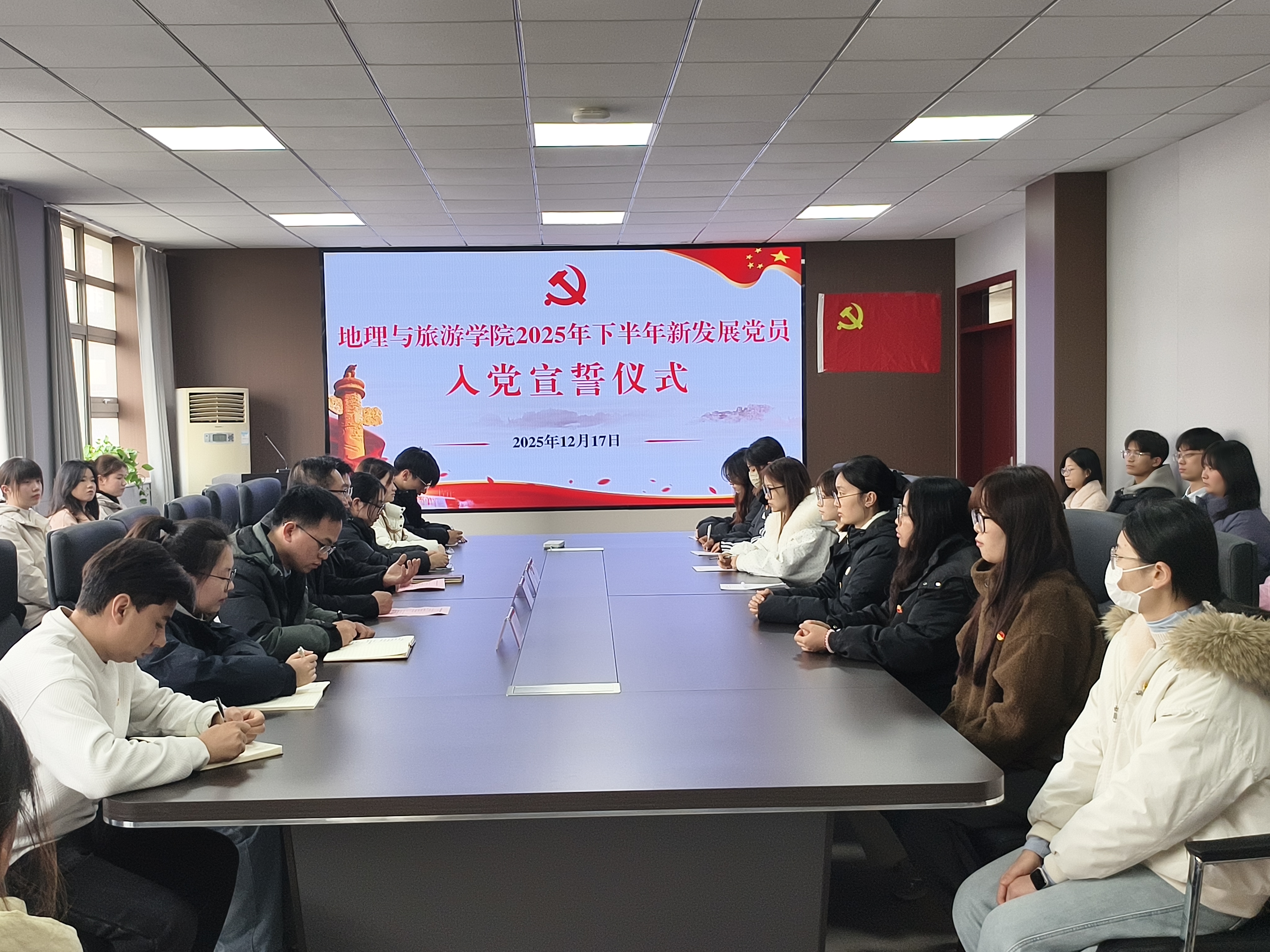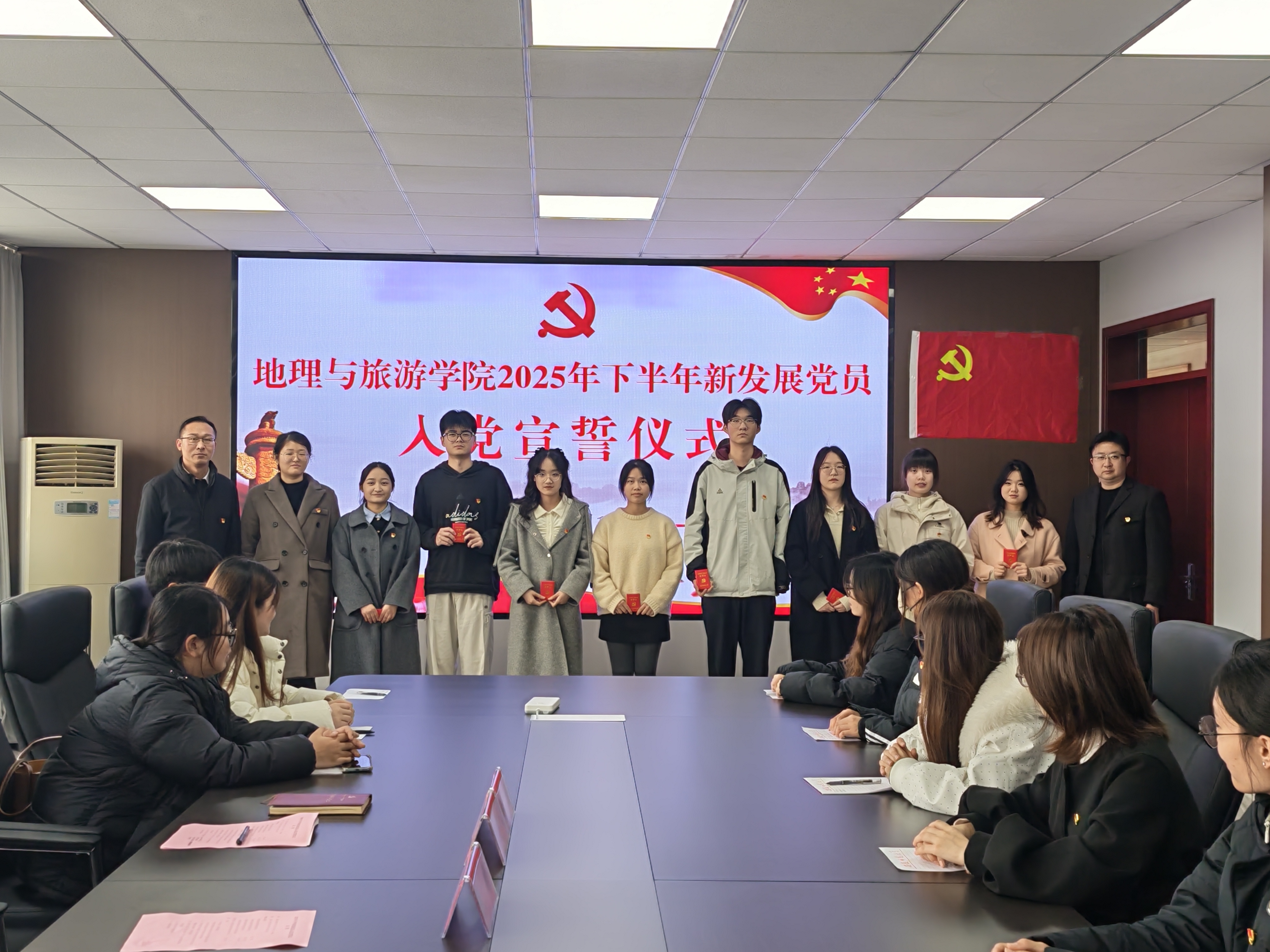 12月17日下午,地理与旅游学院在学院行政楼三楼会议室举行2025年下半年新发展党员入党宣誓仪式,地理与旅游学院党委书记张顺,党委秘书齐小学和全体新发展党员参加。活动由地理与旅游学院党委副书记钱程主持。