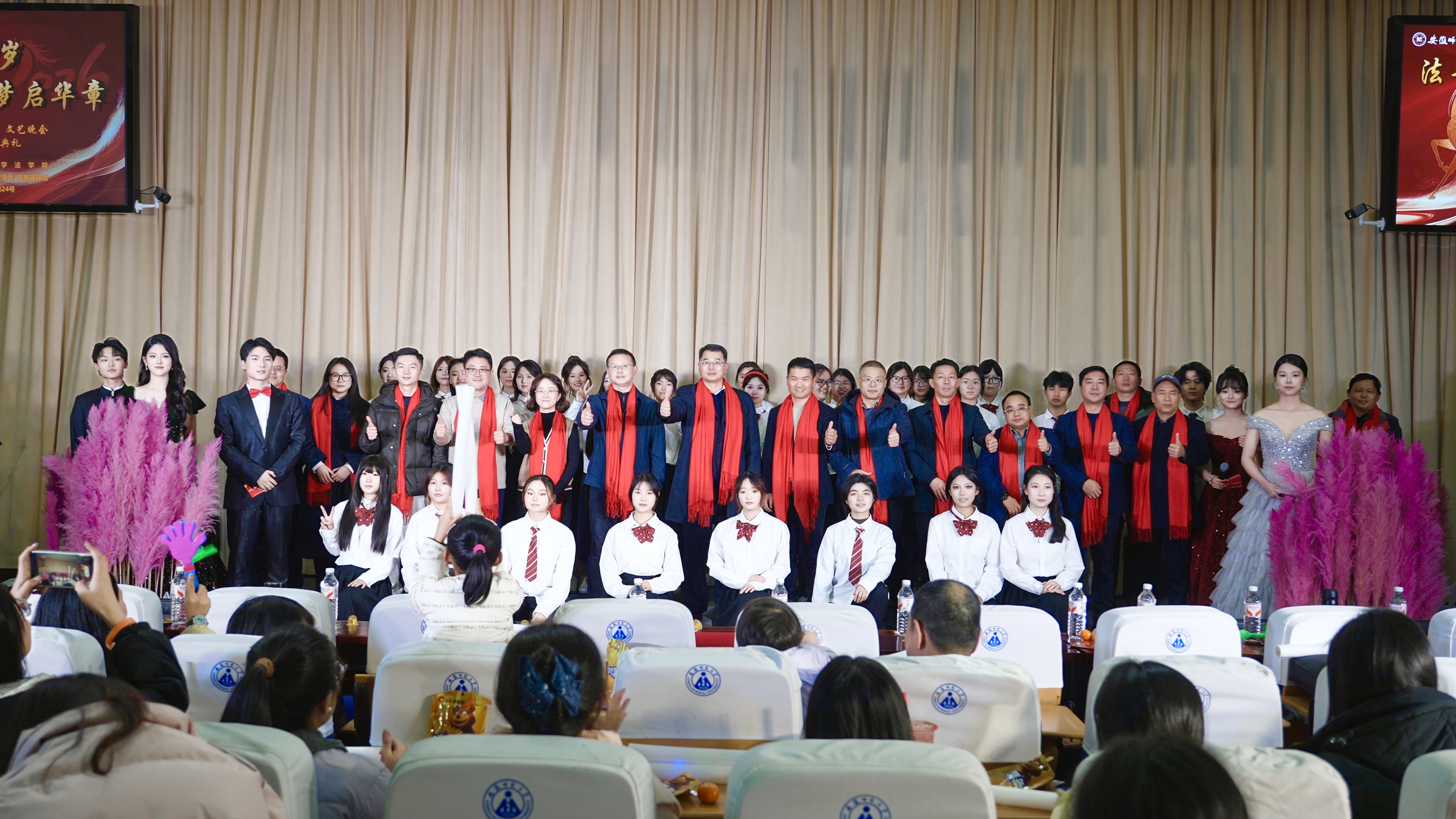 法韵流芳迎新岁,青春筑梦起华章。12月24日晚,法学院于模拟法庭举办2026年“迎新生·迎新年”文艺晚会。学校相关职能部门、上海金茂凯德(芜湖)律师事务所、浙江京衡(芜湖)律师事务所等特邀嘉宾,法学院全体领导班子成员,学院教师代表,2025级全体新生,欢聚一堂,共享盛宴。