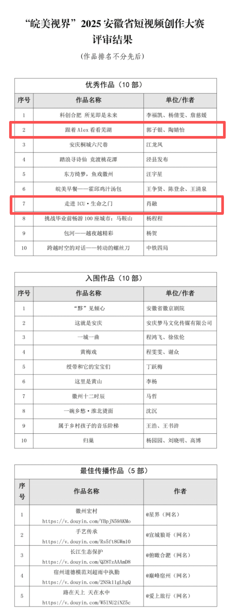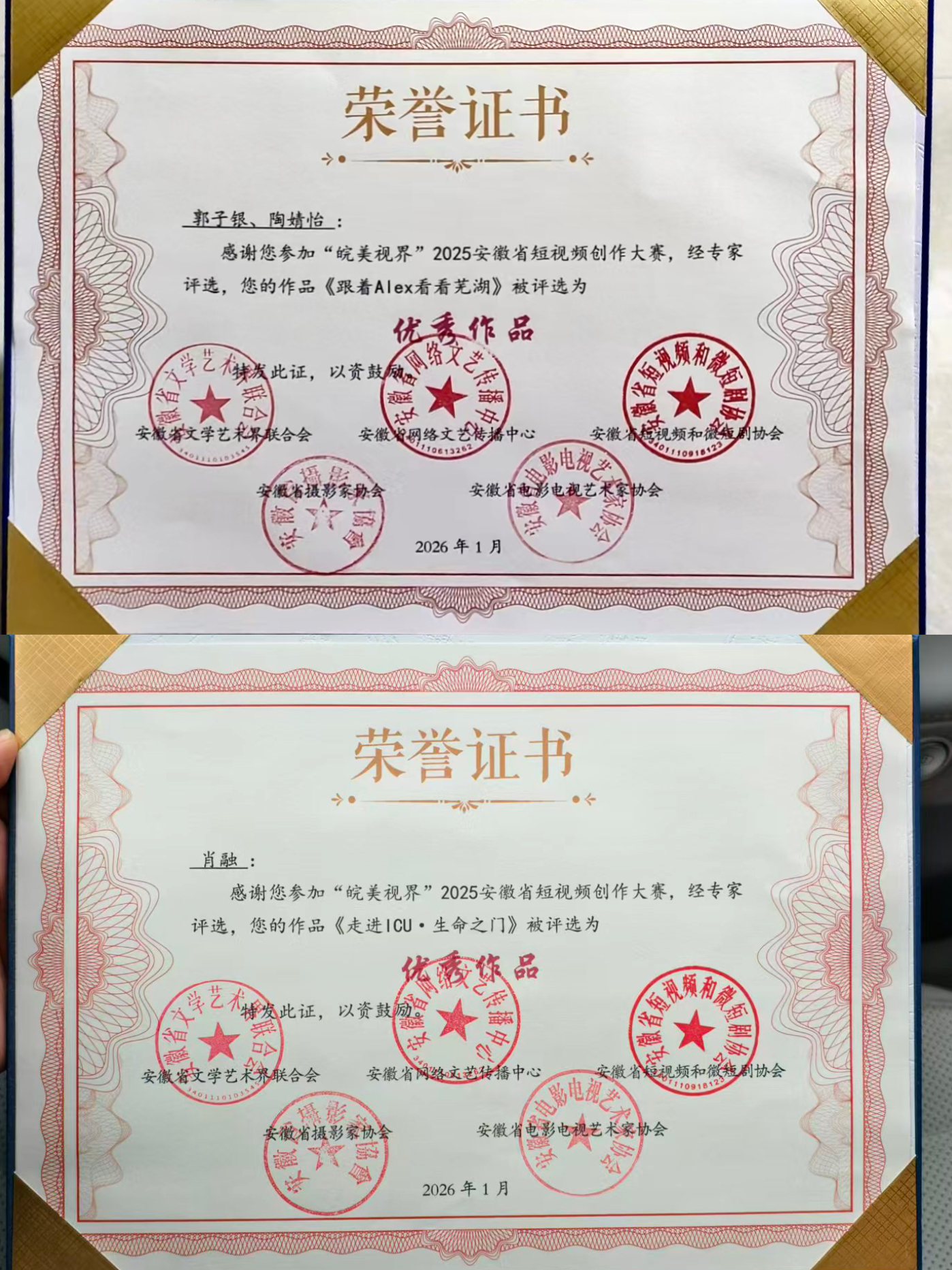 近日,“皖美视界”2025安徽省短视频创作大赛评选结果揭晓,新传学院2024级新闻学肖融、2023级影视摄影与制作郭子银、2023级广告学陶婧怡创作的作品获评优秀作品奖。