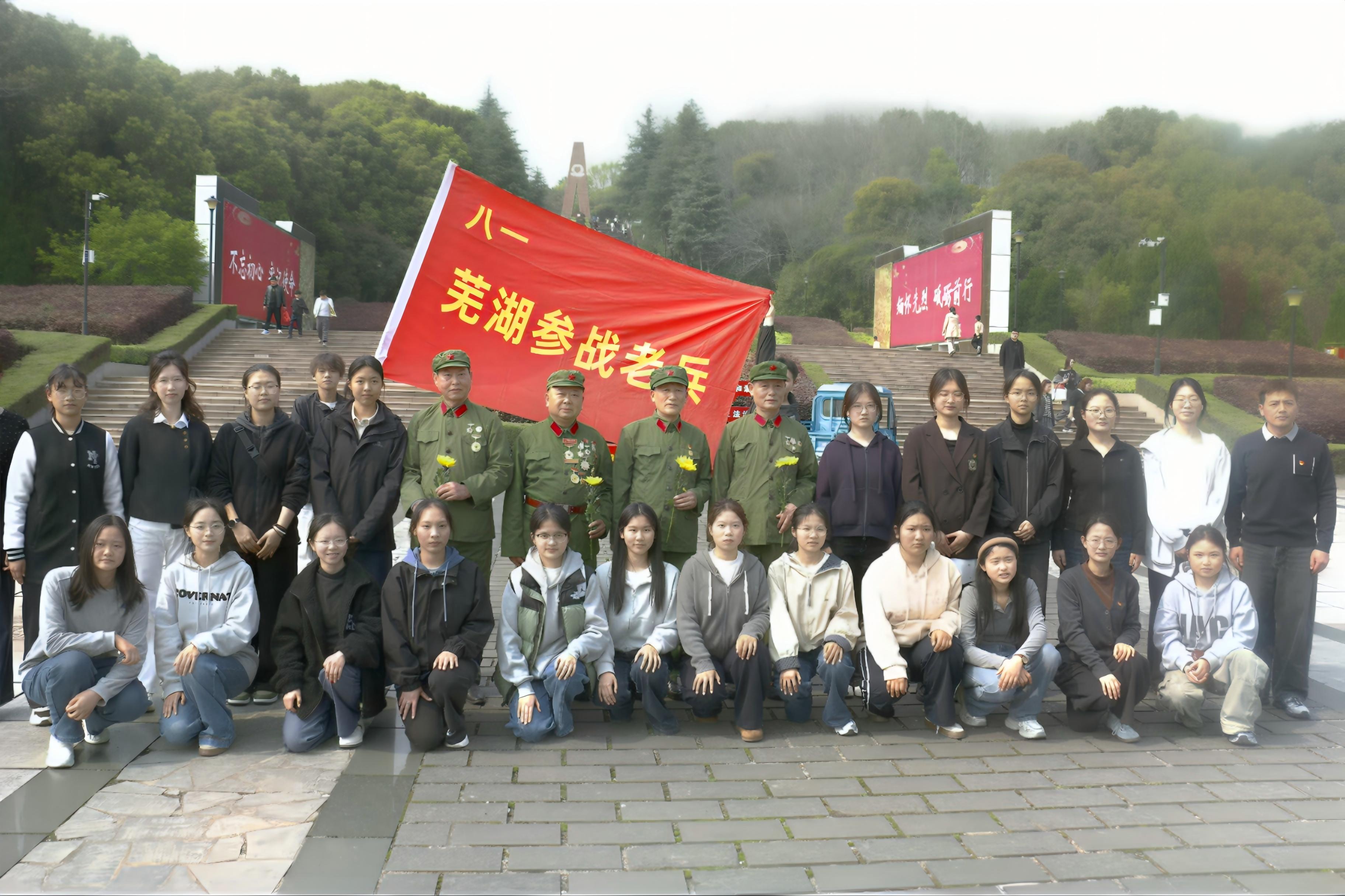 默哀仪式后,宋晓婷、易国梁两位同学现场朗诵诗歌《纪念碑》,以饱含深情的语调诉说碑文中的铁血岁月,师生们在诗行中感悟先烈“捐躯赴国难,视死忽如归”的家国情怀。芜湖市烈士陵园讲解员吴鹏结合纪念碑设计寓意与馆藏史料,生动详实地讲述了芜湖本地的革命斗争历程,让厚重历史变得触手可及,也让大家对革命先辈的奉献精神有了更深切的体悟。活动最后,全体师生在主持人带领下集体诵读碑文,重温芜湖这片热土上的革命征程,铭记英烈留下的宝贵精神财富。活动期间,团队成员还聆听了芜湖老兵讲述的革命故事。