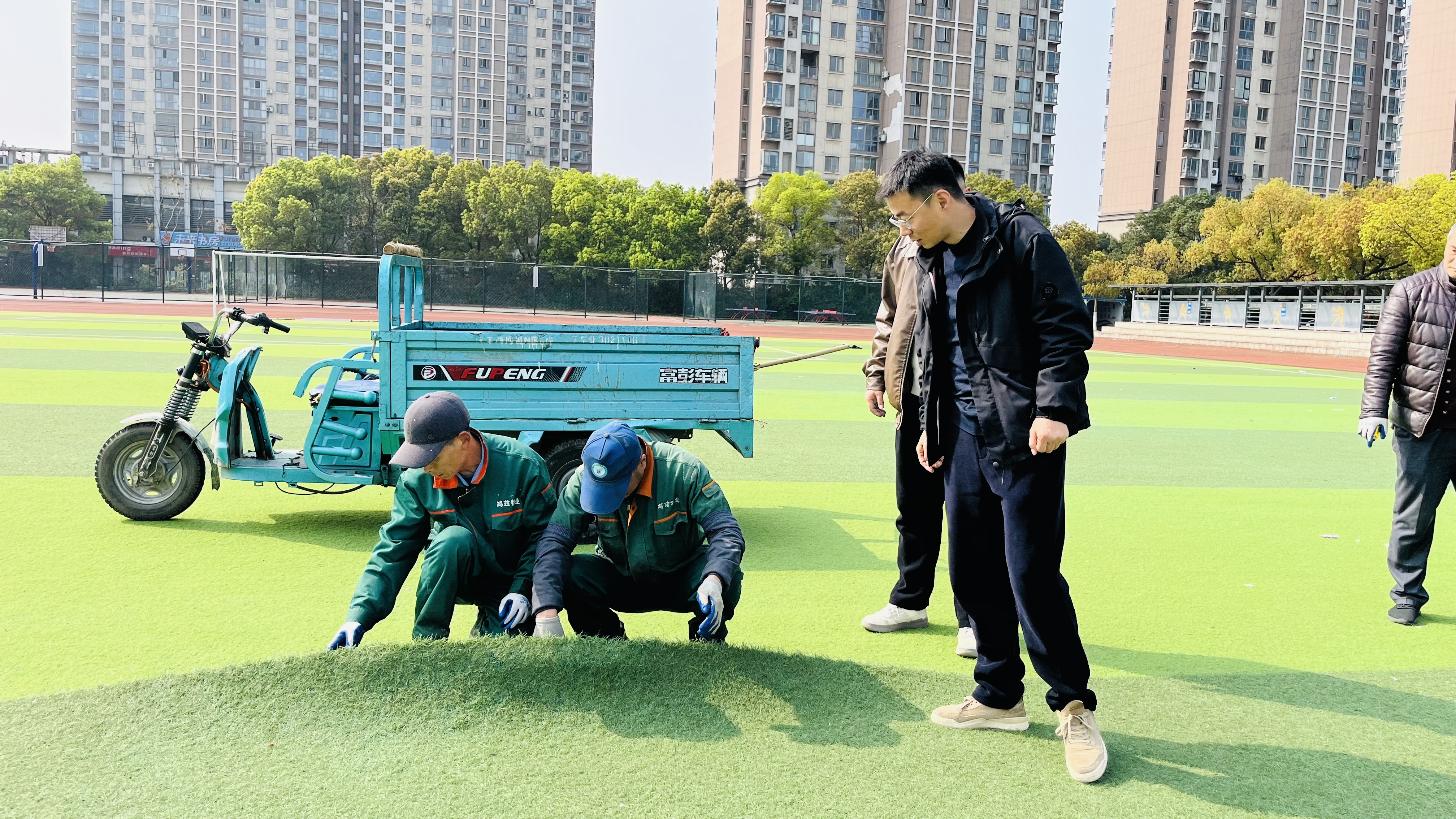 针对巡察反馈的附小校园安全管理存在短板,操场人工草坪出现开裂、鼓包等破损现象,容易造成学生滑倒、磕碰等安全隐患问题,附小积极争取,邀请属地管理部门负责人到操场现场查看,原则同意明年安排专项资金用于操场草坪整体翻新,附小一边组织后勤人员对校园安全进行全面排查,一边通过咨询专家和现场研判,排查梳理出16处安全隐患,结合专家指导与现场研判,制定专项应急维修处置方案,以小投入、快处置的方式利用春假、清明假期空档对破损草坪进行应急维修作业,牢牢守住校园安全底线。