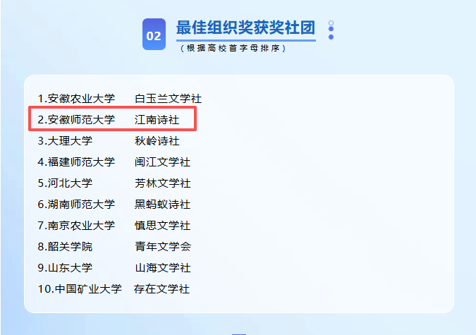 此次获奖,是江南诗社长期深耕校园文学沃土、悉心培育青年诗人的重要成果,也彰显了文学院在校园文化建设与青年文学创作领域的深厚积淀。未来,江南诗社将以此为契机,持续开展诗歌创作、赛事交流等活动,为广大学子搭建更为广阔的文学成长平台,助力校园文化建设高质量发展。