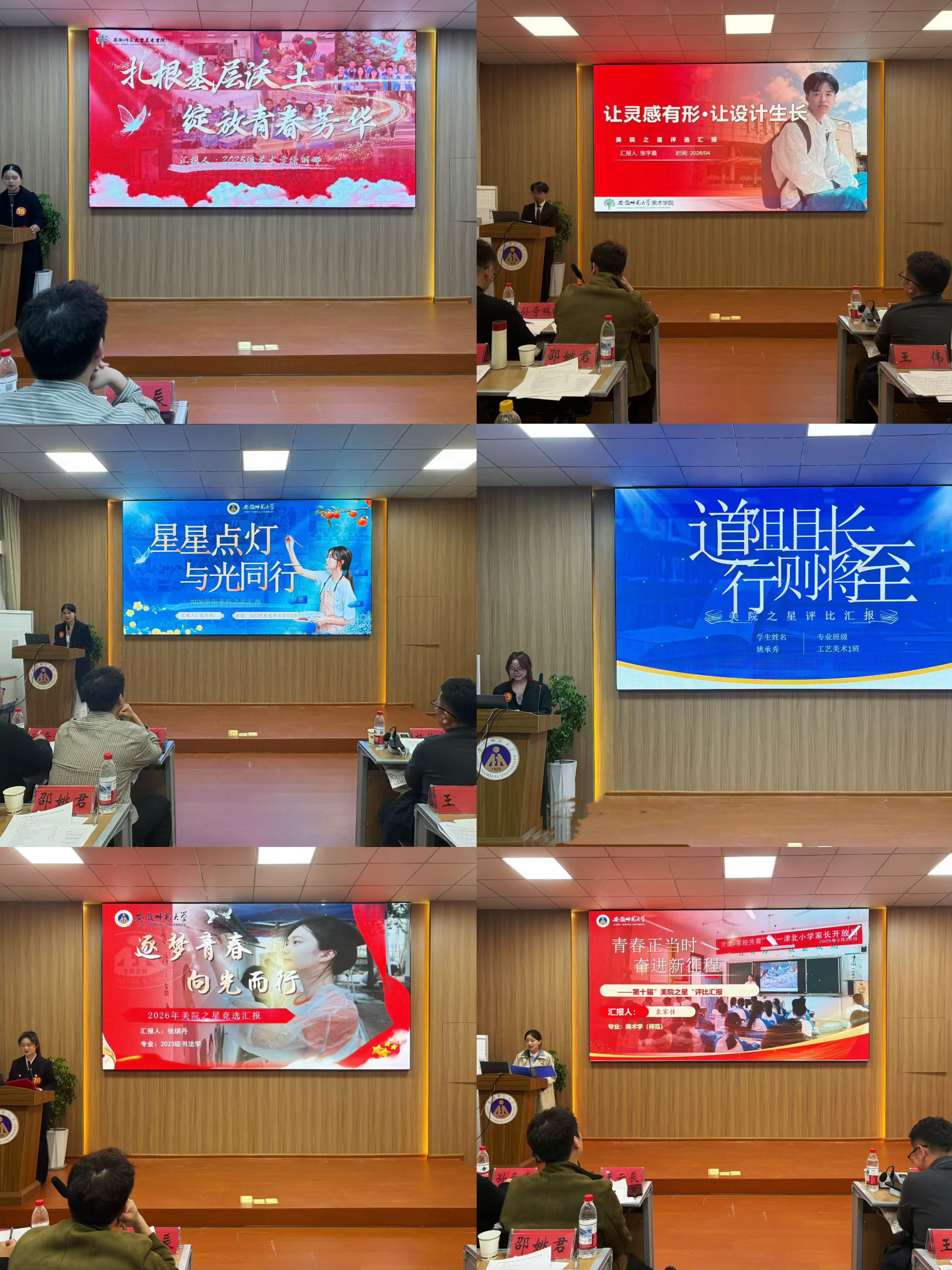 会上,张竹梅详细介绍了“美院之星”评选规则与评审标准。来自各年级、各专业的22名本科生与研究生选手,围绕专业学习、学科竞赛、志愿服务、身心健康、社会实践等方面全面展示个人事迹,分享励志奋进的青春故事。评选涵盖学习之星、志愿之星、创新之星等多个类别,选手们既有深耕专业、作品屡获殊荣的学业标杆,也有投身西部计划、服务基层的志愿先锋,更有勇于跨界探索、彰显创新活力的青年典范,集中展现美院学子德智体美劳全面发展、身心健康、昂扬向上的精神风貌,为2025级新生树立了清晰可学的成长榜样。