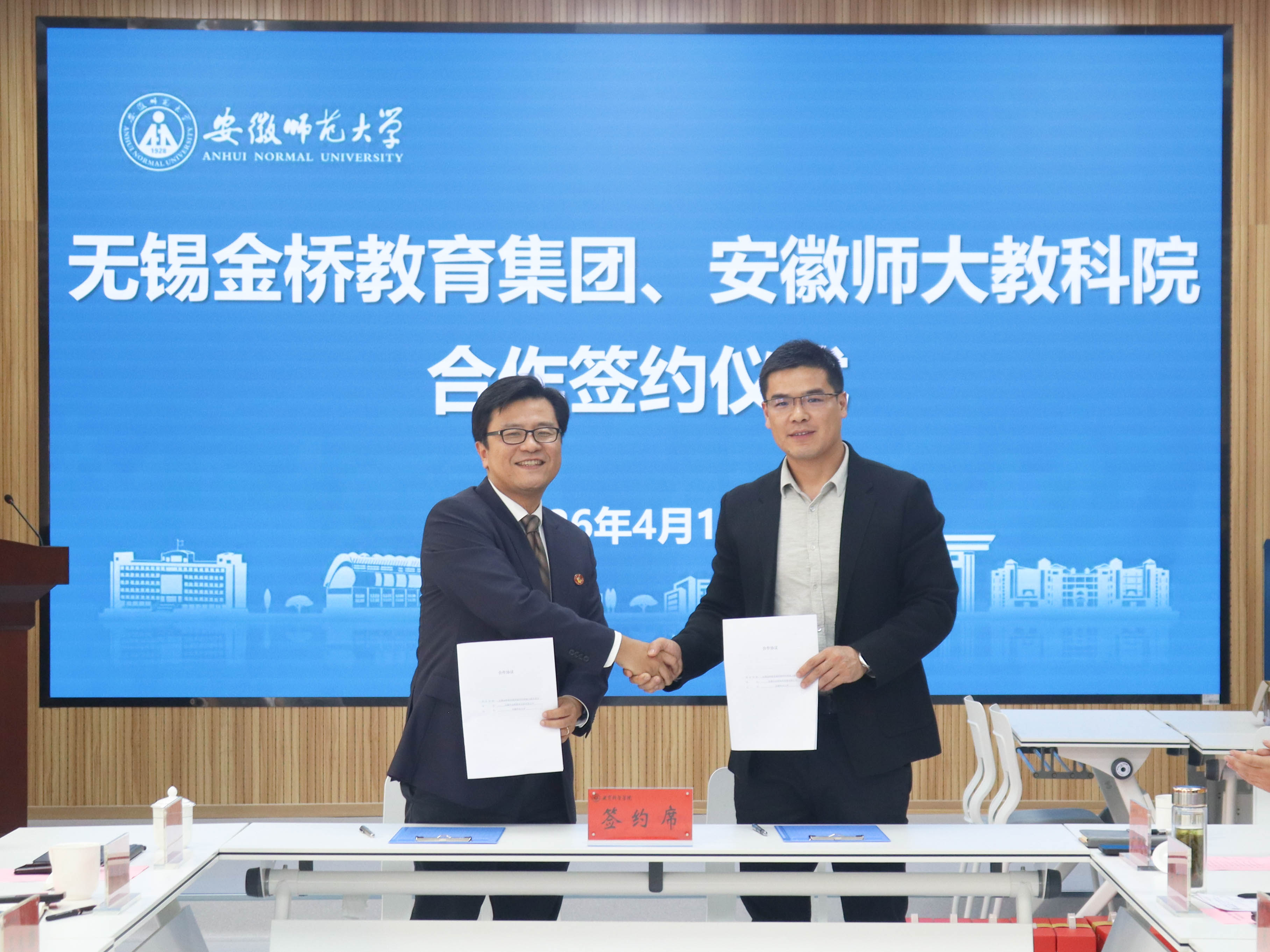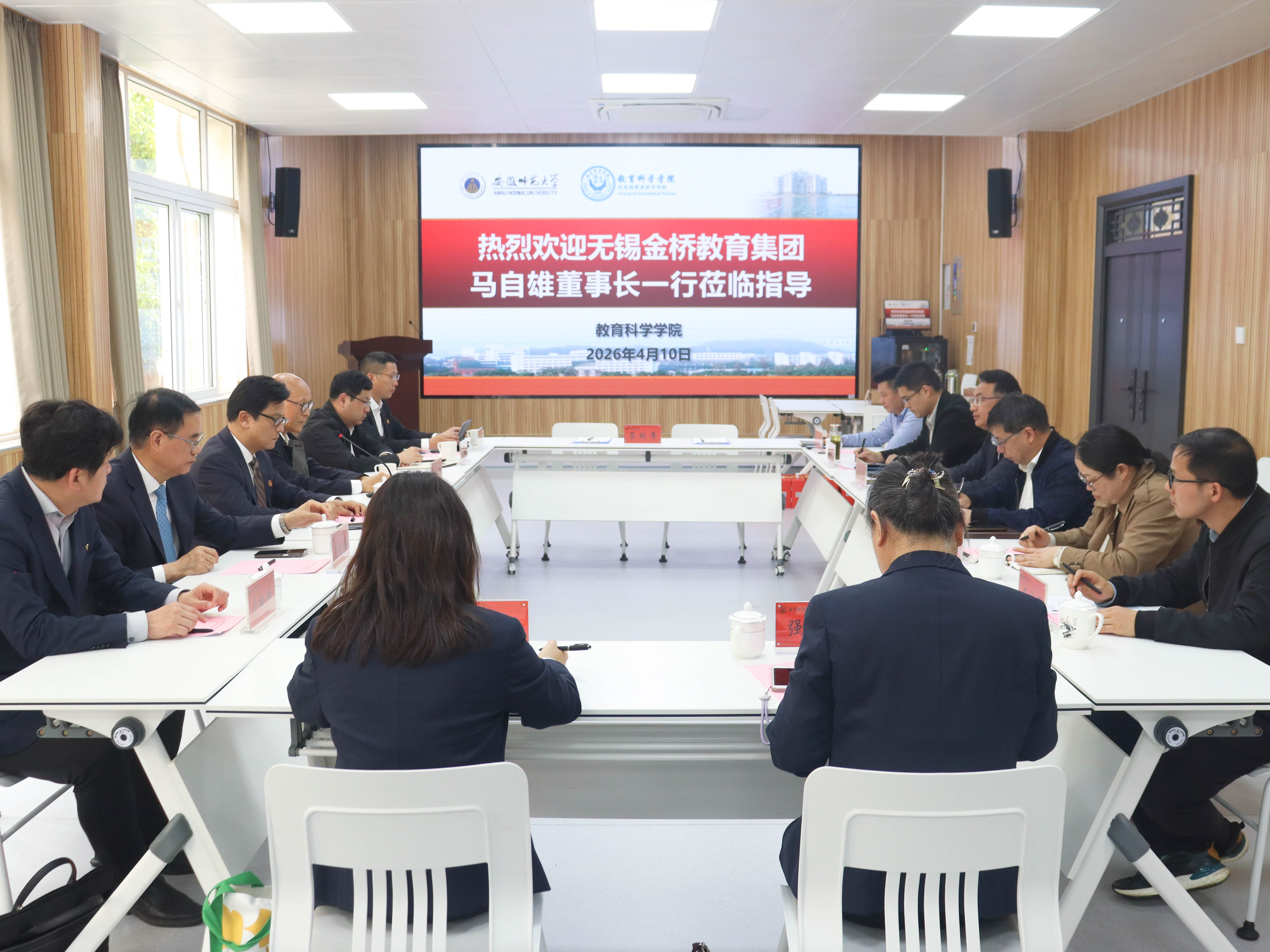 4月10日下午,无锡金桥教育集团一行来我校教育科学学院洽谈合作并签订协议。无锡金桥教育集团董事长马自雄、总经理马翀、副总经理陈东波、总督学凌光明、总经理助理兼综合办主任马松杉、人力资源部主任赵芸、教育研究院副院长强美君,无锡市新吴区金鸿实验学校书记、校长杨开勇,安徽师范大学校友工作办公室主任宋波,教科院党委书记许国飞、院长吴文涛、党委副书记杜凤、副院长王路曦、院长助理王礼军出席签约仪式。会议于教育科学学院一楼会议室举行,许国飞主持会议。