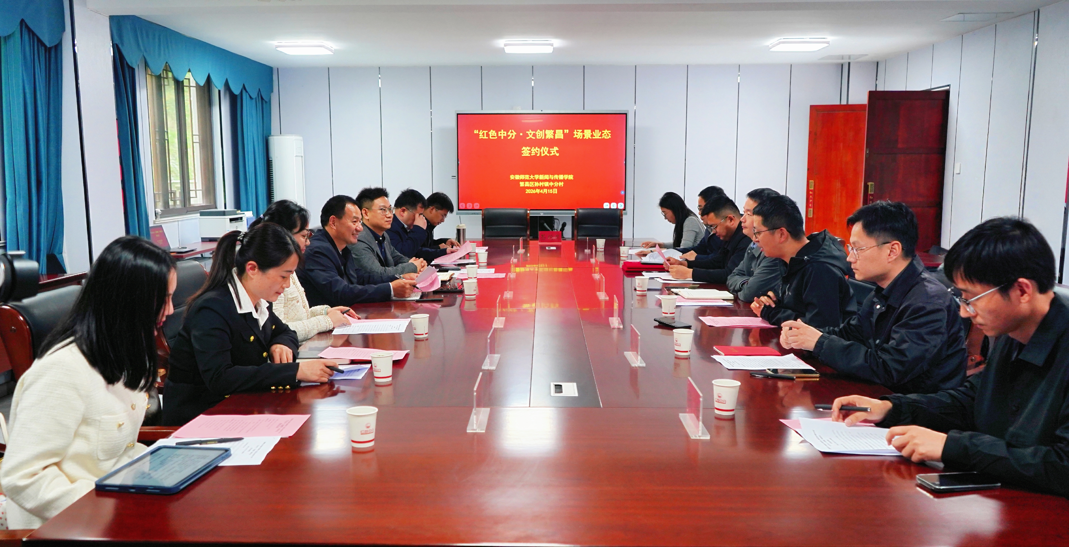 为深入贯彻落实乡村振兴战略,深化校地融合与实践育人改革,4月15日,安徽师范大学新闻与传播学院与芜湖市繁昌区孙村镇中分村“红色中分·文创繁昌”场景业态项目签约仪式在中分村红色学堂举行。此次签约,标志着双方正式搭建起“红色文旅+媒体实践+乡村振兴”三位一体综合实践平台,以专业力量赋能乡村发展,以实践育人深化产教融合,共同打造高校服务乡村振兴、创新实践育人的标志性合作成果。