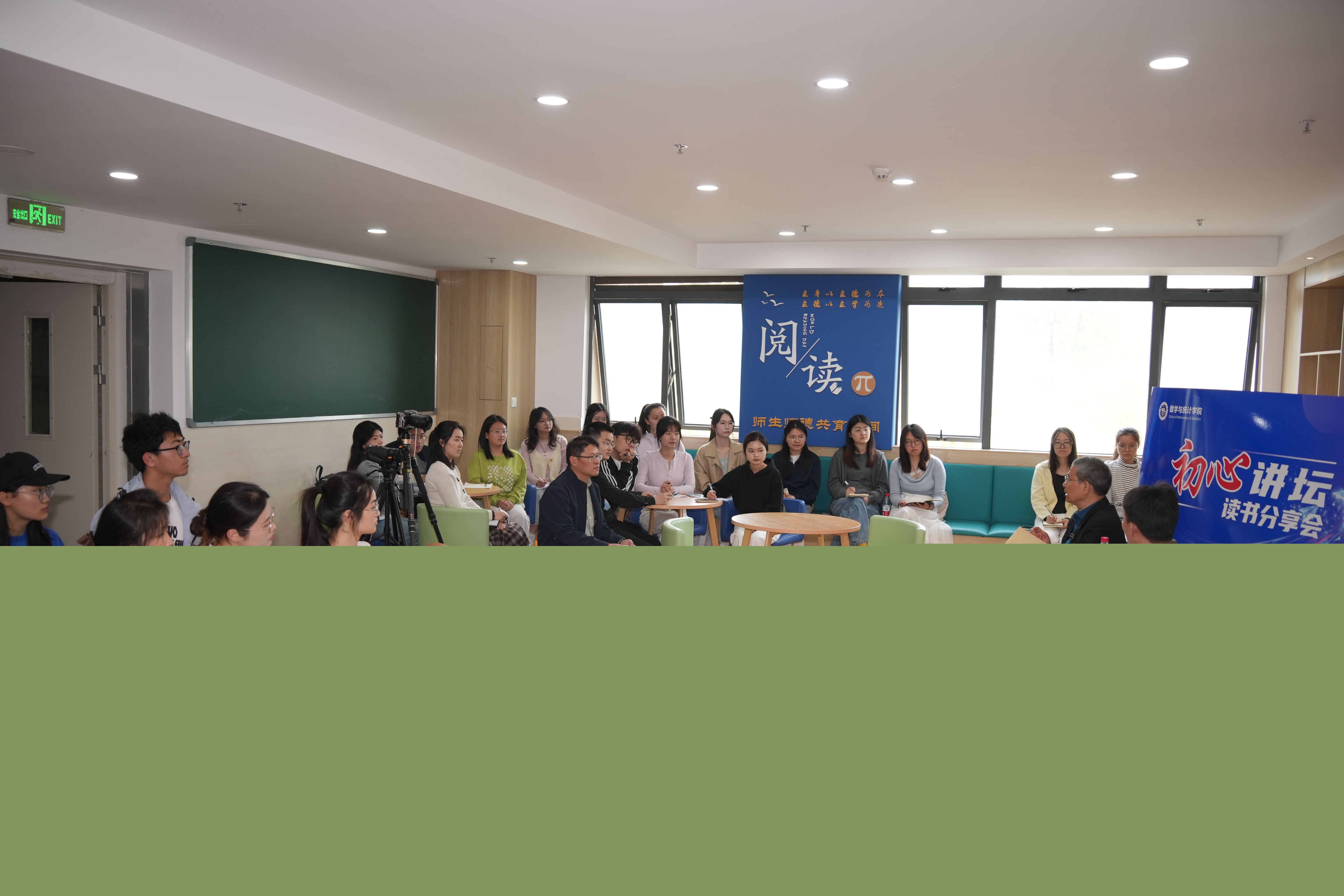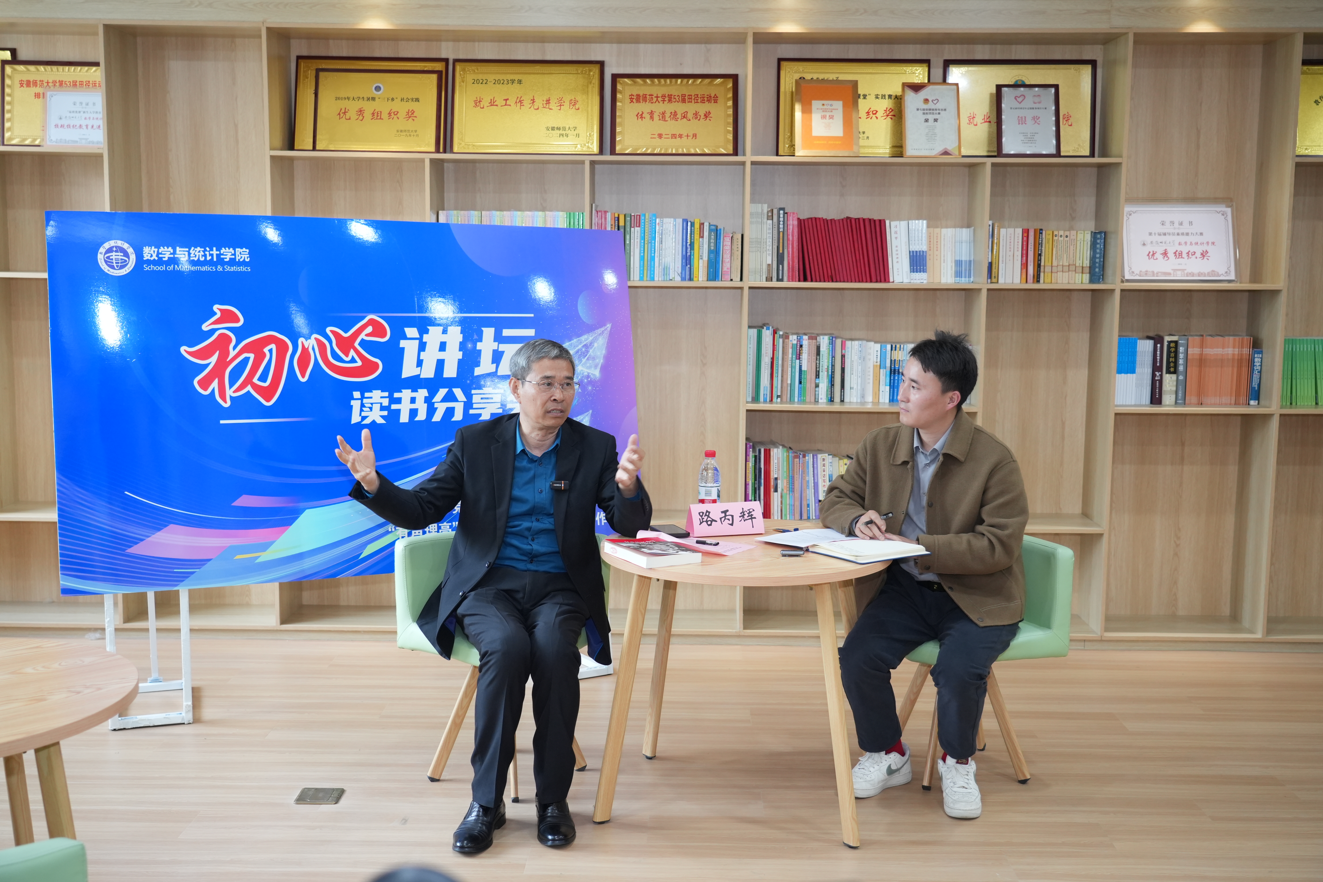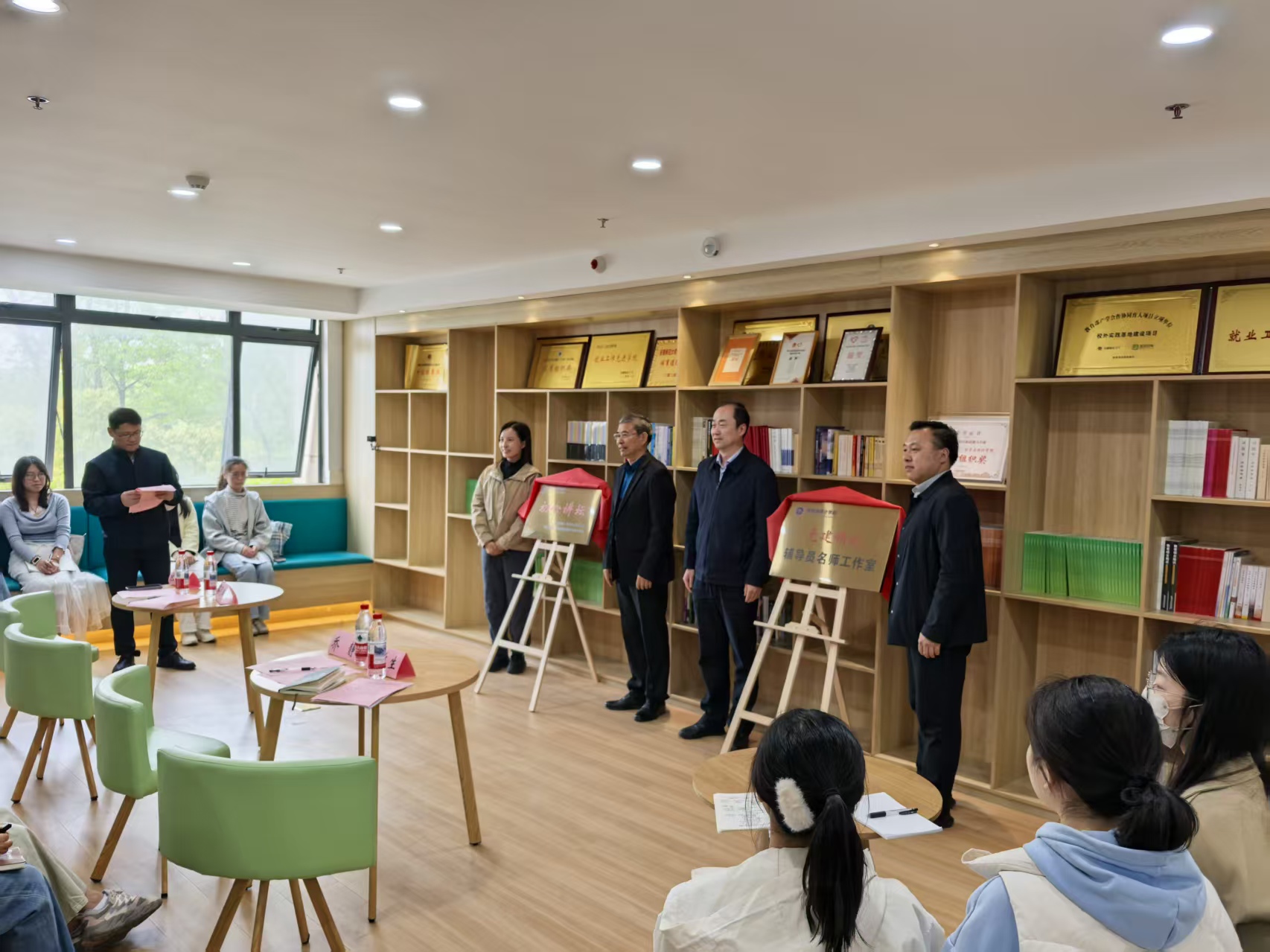 为深入学习贯彻习近平新时代中国特色社会主义思想,全面落实立德树人根本任务,切实以党建引领大学生思想政治教育工作,4月17日下午,数学与统计学院在文典楼C区二楼“阅读π”空间举行“初心讲坛”系列读书分享活动(第一期)暨“党建领航”辅导员名师工作室揭牌仪式。党的二十大代表、马克思主义学院教授路丙辉,校党委学工部部长乔静,校团委副书记张虹,数学与统计学院党委书记黄友生,学院全体专职辅导员及四十余名学生代表参加活动。仪式由学院党委副书记杨礼玉主持。