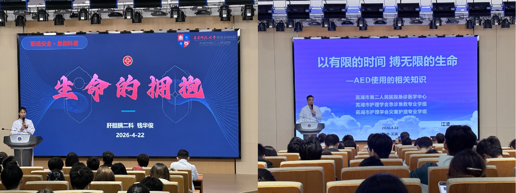 为进一步普及应急救护知识,夯实师生急救基础,提升校园应急处置水平,4月22日,生命科学学院邀请中华护理学会理论专委会委员、芜湖市护理质控中心常务委员高国昀、华师附院(芜湖二院)肝胆外科护士长钱华俊、急诊科护士长江波、重症医学科护士长王雅鑫、神经外科监护室重症专科护士洪慧等医护专家等一行来校,为学院团学骨干和寝室长作急救知识技能普及专题培训。镜湖区知联会成员,学院党委副书记孙月婷与部分老师参与本次培训。