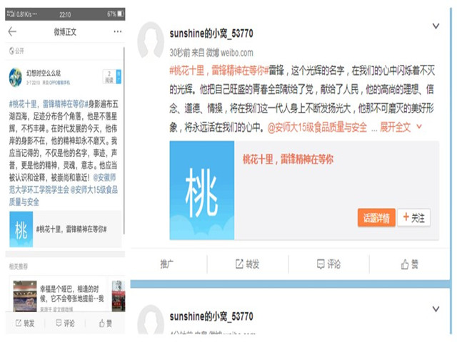 依托网络,爱心在传递。志愿者们利用腾讯“公益捐步”平台,每一个人一天中走到10000步,即可“捐步”,顺丰公益基金会根据步数,折换为人民币,捐给需要帮助的人们;利用支付宝“蚂蚁森林”平台,每天记录低碳绿色足迹,用以兑换实体树苗种植在内蒙古阿拉善地区。学生会在微博上发起了“桃花十里,雷锋精神在等你”的话题讨论,呼吁每一个参与到志愿服务中的蒲公英志愿者们记录下志愿服务的心得体会,并传递给更多的人。