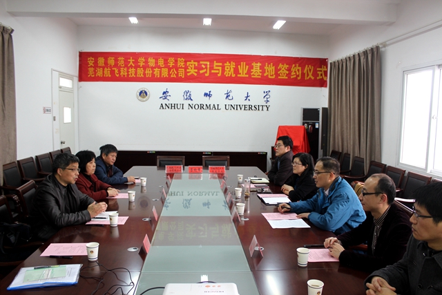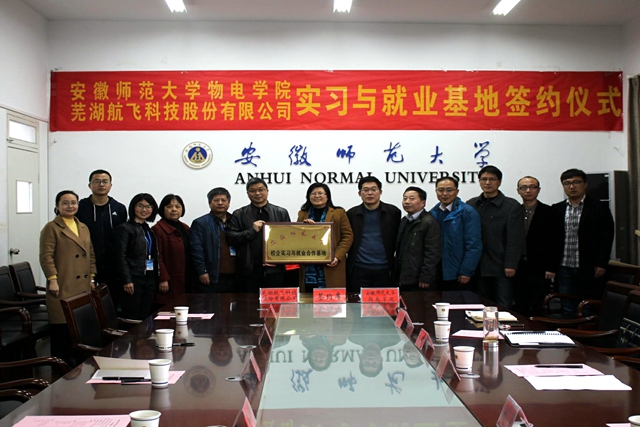 仪式上,吴长义介绍了校院办学基本情况,特别就师资力量、专业建设、人才培养等情况做了详细说明。陈之典介绍了公司的发展情况与未来规划。院党委书记李娟对陈之典一行表示热烈的欢迎,她表示,物电学院多名教授、博士从事的领域研究与航飞科技公司的产品研究联系紧密,学院相关专业学生也是贵公司需要的人才,实习与就业基地的建成将促进双方在人才培养、实习就业、项目研究等多方面交流与合作,对双方的发展具有重要意义。会上,双方就实习、就业、科技合作进行了深入洽谈,交换了意见。随后,李娟和陈之典分别代表安徽师范大学物电学院和航飞科技股份有限公司共同签订了“实习就业基地”共建协议,院科研副院长郑贤锋与航飞科技股份有限公司办公室副主任周灵利为基地授牌。