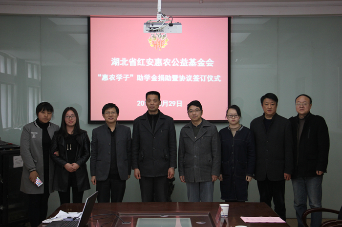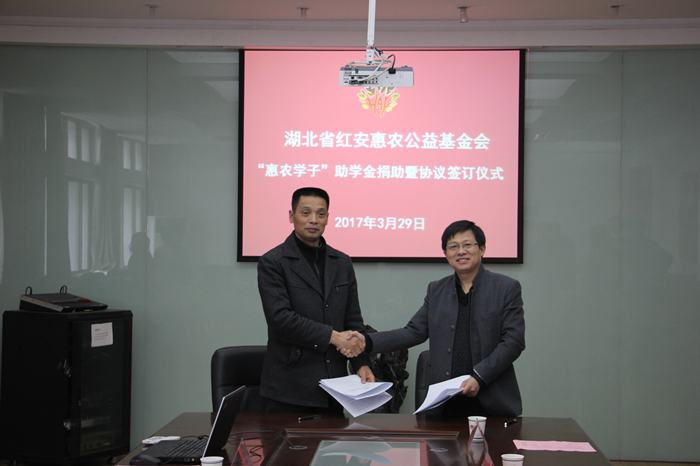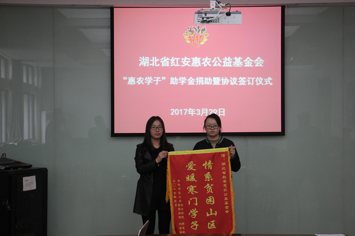 湖北省红安惠农公益基金会是经过湖北省人民政府民政厅批准登记的非公募基金会,2012年12曰19日在湖北省红安县高桥镇李先念故居纪念园正式成立。此次2017“惠农学子”助学金项目计划向在我校就读的2名金寨县籍学生各捐助人民币壹万元,用以支付学生的学习和生活费用。