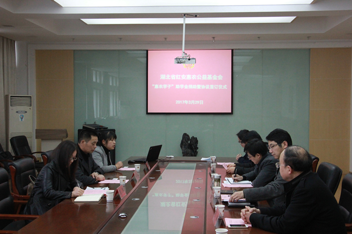 本网讯(美术学院)3月29日上午,湖北省红安惠农公益基金会“惠农学子”助学金捐助及协议签订仪式在美术学院会议室举行。湖北省红安惠农公益基金会理事长刘兴旺、校学生工作处处长台启权、美术学院党委书记王继民、音乐学院党委副书记奚泰来、美术学院党委副书记张韬、受助学生及相关工作人员出席了仪式。仪式由美术学院党委书记王继民主持。