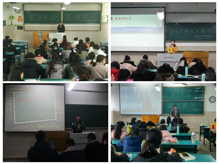 安全教育——主题班会进行时。安全防范,教育先行。开学以来,学院以年级为单位,先后组织召开了“实习与安全”、“安全伴我行”、“护航青春”等主题班会,系统介绍了同学们在教育实习、就业创业以及日常生活中可能遇到的安全问题及应对措施,要求同学们要严格遵守安全纪律,不断增强安全意识,切实做好安全防范工作。
