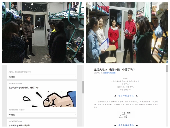 生活防范——警惕诈骗早预警。为有效应对电信网络诈骗给同学们带来的伤害,学院于近期在微信公众号上推出一期“生活大爆炸——电信诈骗,你怕了吗”的文章,详细介绍了当前最新的各类电信诈骗手段,帮助学生识别电信诈骗,多一份谨慎、少一份懈怠,做到防患于未然,共同营造一个安全和谐的平安校园。