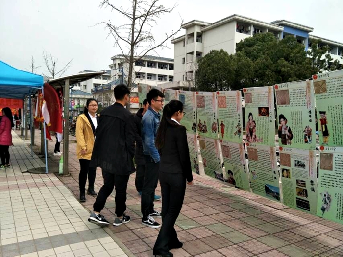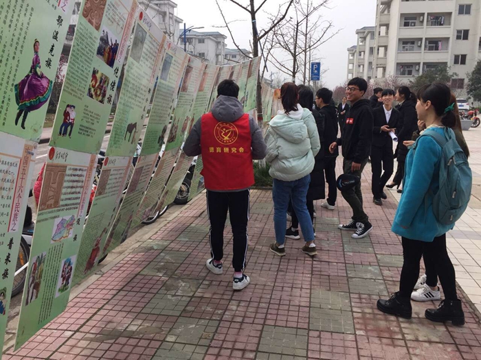 伴着舒缓的音乐与温暖的春风,风情展顺利开始了。展板边三三两两地聚集着前来观看的同学们,有的展架前还爆发出阵阵欢乐的笑声,展板边还有面带微笑的宣讲员,他们服装统一,热情洋溢,肢体语言丰富,绘声绘色地讲解着各民族的特色文化。