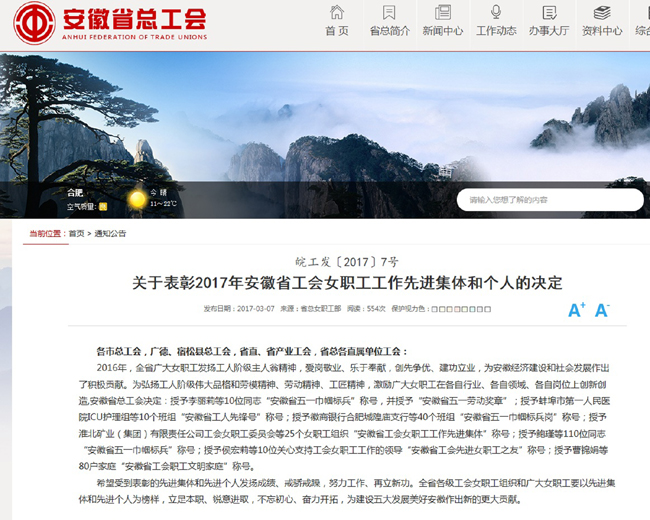 据悉,本次省总工会在三八节前夕表彰了包括傅新球老师在内的全省各条战线110名优秀女同志为安徽省“五一巾帼标兵”,省教育系统仅三名,我校仅一名,实在难能可贵。