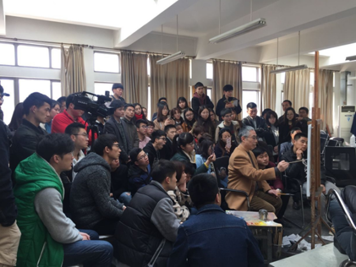 整个教学过程分为理论讲授、课堂示范两个部分。在理论讲授部分里,李教授用春风化雨般地讲授将晦涩难懂的美学理论和难以言传的技法理论一一点拨开来,让聆听的学生获益匪浅。课程的后半部分为李教授的现场示范。课堂示范教学是专业教师教学中的要项,“形同工作的伦理。”现场写生是对教师技法能力和教学能力的双重考验,李方明教授采用这种教学方式,是“希望经由写生,寻获绘画的谦逊”。观摩课持续近两个半小时,围观学习的学生屏气凝神,大家都很珍惜这次现场观摩教学的机会,近距离感受着艺术家的创作过程,受益良多。