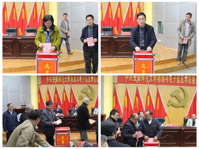 大会审议并通过了《学院党委关于党费收缴、使用和管理的情况报告》、《中共安徽师范大学物理与电子信息学院委员会换届选举办法(草案)》和《总监票人、总计票人、监票人、计票人建议名单》,并以无记名投票的方式选举方明星、李娟、吴长义、张其芳、张季谦、郑贤锋和崔光磊七位同志为新一届党委委员。大会在庄严的《国际歌》声中顺利闭幕。