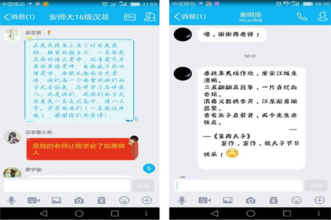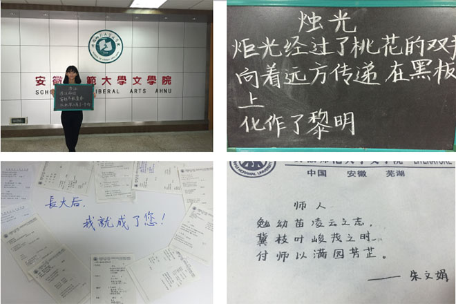 文学院学子积极参与网络互动,在微信、QQ等媒体平台上表达对老师的感恩之情。“滇南义散桃李芳,江东新育嫩蕊繁;古有朱子启前贤,而今先生亦铁肩。”2016级汉语言文学(非师范)专业新生谢明炀为辅导员周青松作诗《周夫子》,送上佳节的祝福。其他新生在班级的QQ群里踊跃的吐露心声,为自己的高中老师留言,“是我的老师让我学会了如何做人。”“感谢老师陪我走过高中,进入大学……”在留言中,学生们将授业恩师对自己的点滴关照娓娓道来,在节日里畅谈恩师事迹,表达自己对恩师由衷的谢意,为恩师送上节日的祝福。