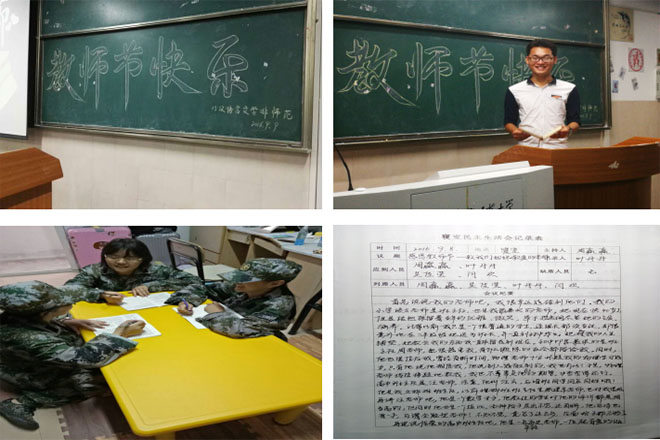 黑发积霜织日月,粉笔无言写春秋。教师节前后,各班召开主题班会、寝室座谈会等形式,面对面沟通,共话师恩。2015级汉语言文学(非师范)、秘书学专业召开主题班会,共同祝愿老师们节日快乐。2016级汉语国际教育专业的学生们拟定了“铭记师恩,感谢师恩”、“感恩教师节——致我们始终敬爱的老师”等议题,以寝室为单位召开民主生活会。学生们在寝室里与室友分享印象最深刻的老师;在融洽的氛围中讲述与老师之间难以忘怀的感人瞬间;在回忆过往中感悟师生传承的浓浓恩情。“老师们把一生的年华都奉献给了教育事业,奉献给了当初不懂事的我们,教师节来临之际我们衷心祝他们教师节快乐、身体安康。”会议结束后,学生们将会议感悟记录在案,在大学寝室生活的经历上留下浓墨重彩的一笔。