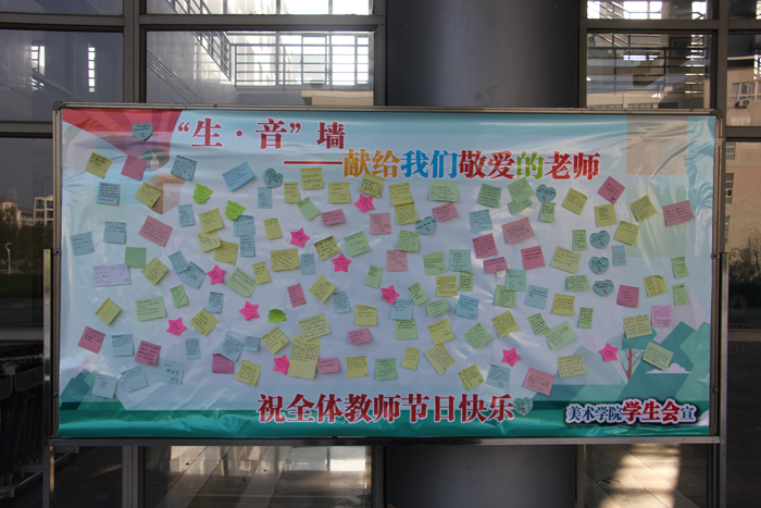如果我能高高飞翔,感谢您给了我一双有力的翅膀不计辛勤一砚寒,桃熟流丹,诗画满人间,英才济济笑开颜,老师节日快乐!”这是美术学院门口学生们精心制作的“生音”墙,同学通过爱心纸条,写上自己对老师们最想表达的话语,传递自己最真实的声音。