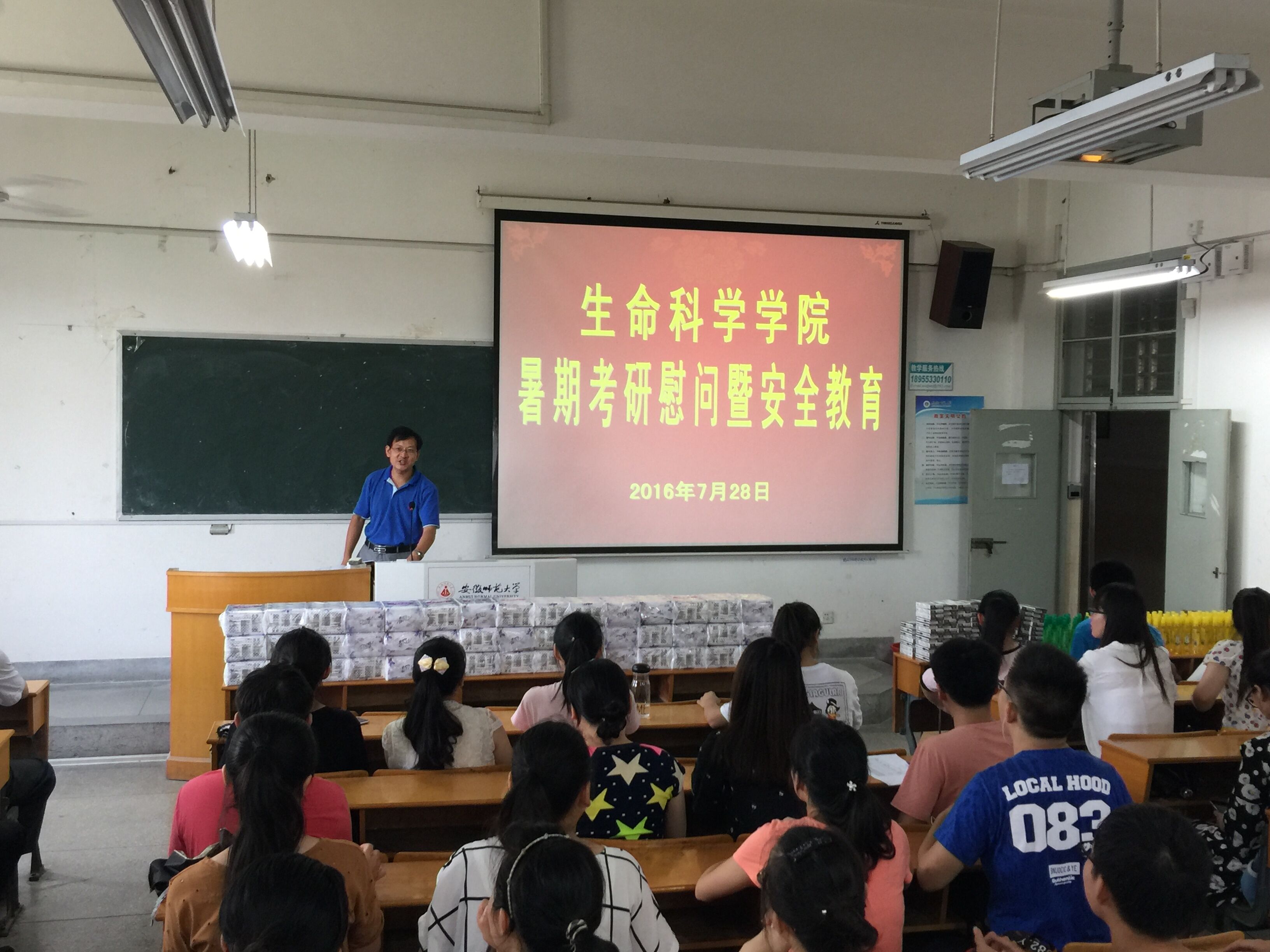 生科院院长吴孝兵向同学们介绍了学院2016年考研录取率近50%,更有一个专业突破60%的喜人局面,大多数毕业生被中科院、中科大和985高校录取,学院考研录取率再次位居全校前列。成绩鼓舞人心、令人振奋。他指出生科学子向来追求卓越,已有一名校友成功当选院士,近十位校友先后成为国家杰出青年基金获得者,彰显了学院办学质量和院风学情。他分析了考研的意义,指出大学教育是为了追寻真理、创造知识,读研是完成这一目标必经之路,同时也是自我提升、实现人生价值的好路径。他鼓励备战考研学子,要静下心来,耐得住寂寞,全面复习重点掌握,通过假期的苦学为考研打下扎实基础,并预祝大家考出优异成绩。