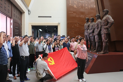开展入党宣誓活动。7月9日,在职党员、入党积极分子赴无为县红庙村参观“新四军第七师纪念馆”接受党史教育,唐俊生同志给全体党员作党史教育报告,党员们分组进行了座谈,观看实物史料,重温了当年新四军七师从建立到发展的艰苦历程,同时接受了廉政洗礼。在一楼大厅党员们重温入党誓词,用仪式感增强使命感,促使党员不忘初心、牢记使命,坚定理想信念,牢记党的宗旨。
