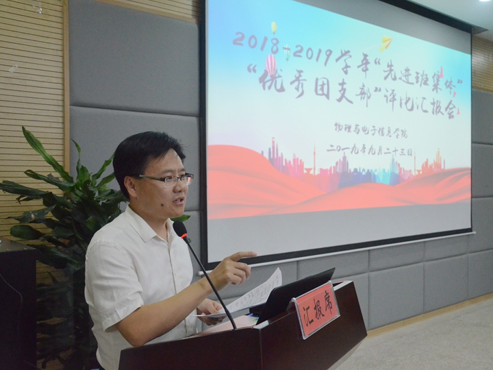 本网讯(物电学院 宋凤楼 陈月)9月23日晚,物电学院在物理楼304报告厅举办2018―2019学年“先进班集体”“优秀团支部”评选汇报会。校党校常务副校长、组织部副部长谢超峰,宣传部副部长詹剑锋,教务处副处长、创新创业学院副院长崔光磊,学生处副处长张玉新,团委副书记汪凯,学院党委副书记黄友生担任评委。学院本科生全体辅导员、各年级学生代表参加了会议。汇报会由学院团委书记宋凤楼主持。