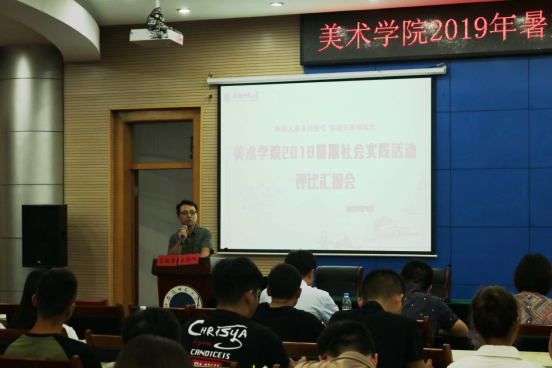 本网讯(美术学院团委 闻艺)9月27日晚,美术学院在花津校区会议中心第三报告厅举行了2019年暑期社会实践评比汇报会,围绕习近平总书记提出的“年轻人要‘自找苦吃’”主题,全面交流总结2019年暑期社会实践工作。美术学院党委副书记朱琳、指导教师代表程奇、全体专兼职辅导员参加会议并担任评委。各暑期社会实践团队成员以及2018级各班级学生干部代表参加了会议。会议由美术学院团委书记李高举主持。