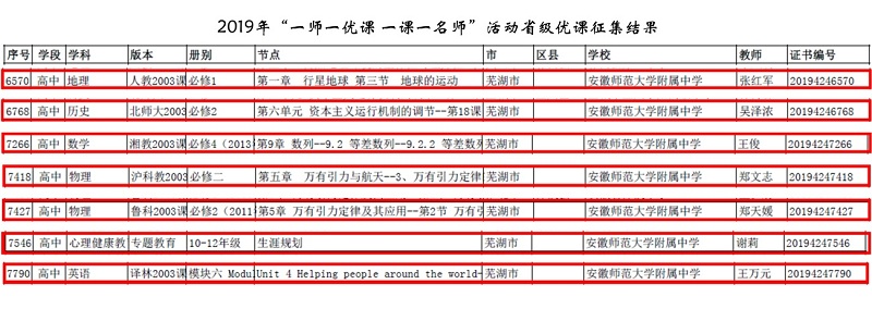 本网讯(附中   李居旖)2019年度“一师一优课、一课一名师”活动省级优课征集评选活动已经结束,省教育厅组织学科专家组对各市推荐的市级“优课”进行了严谨、细致的初评和复评,共征集省级“优课”8019节,其中高中组“优课”共入选1472节。安徽师范大学附属中学(下称附中)共有7位教师课例入选省级“优课”。