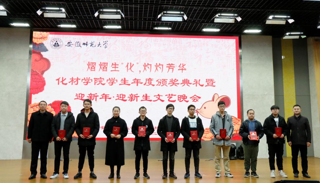在晚会节目之间,学院对在2019年度取得优异成绩的集体和个人进行了表彰。其中有用实力诠释师大骄子风采、用志愿服务收获意义人生、用汗水在赛场上挥洒辉煌的“模范化材人”;有在社会实践中锤炼品德修为,在集体建设中强化责任担当的“奋进化材人”;也有用技能夯实基础,用知识武装头脑,用毅力与拼搏追寻梦想,用高远目标和必胜决心挑战未知的“卓越化材人”。 这些优秀的模范形象,传递着青春正能量,也为19级新生做出了引领与榜样。学院通过颁奖典礼来激励化材学子在2020年里不懈拼搏、勇攀巅峰。