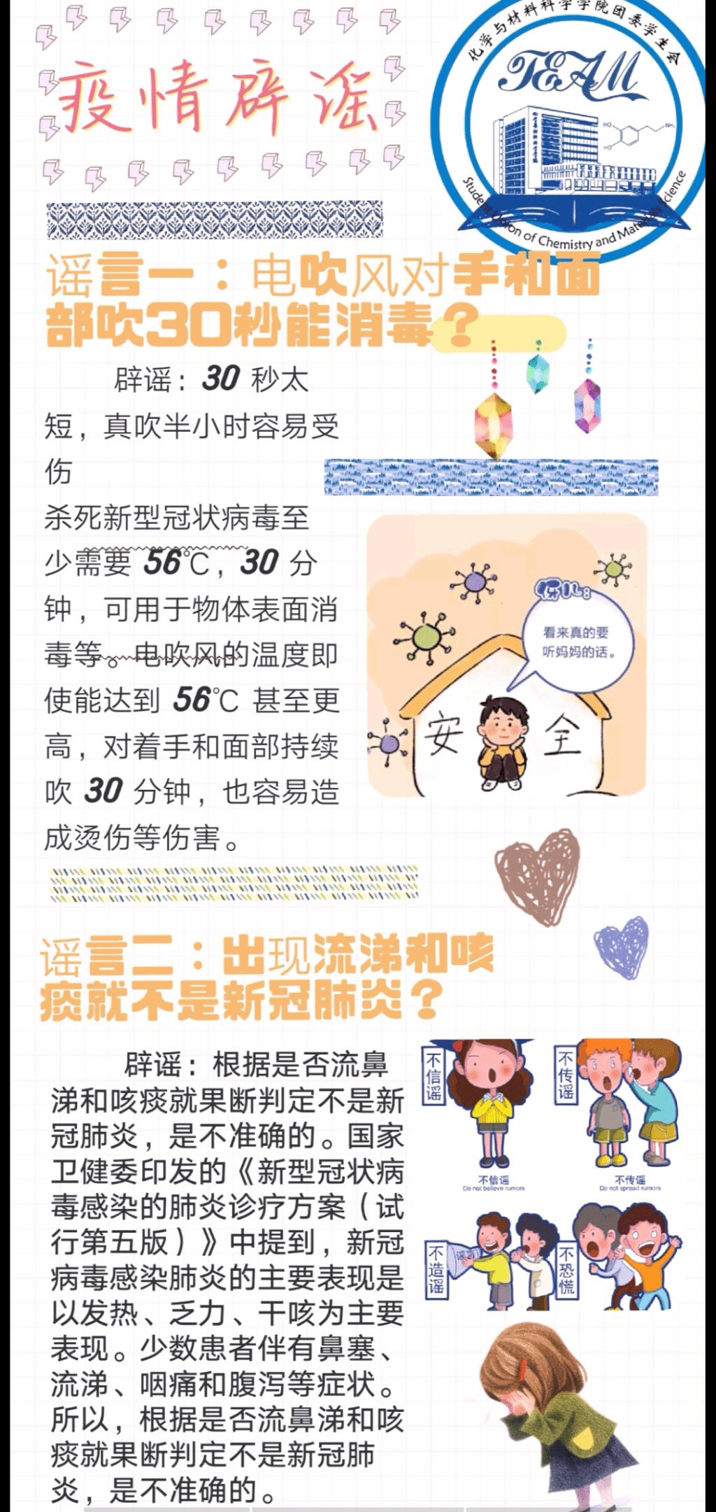 科普知识领方向,勇当疫情宣传兵。时值假期,化材学院按照学校疫情防控要求,积极发布相关的疫情防控通知,通过今日校园平台及时统计学生的身体状况以及心理状况。与此同时,学院利用各类网络平台每日发布更新新冠肺炎的确诊情况、有关防疫的注意事项及热点新闻,对关于新冠肺炎的传谣做出了科学的解释,鼓励公众不信谣、不传谣,传播科学防控知识、遏制网上谣言传播。