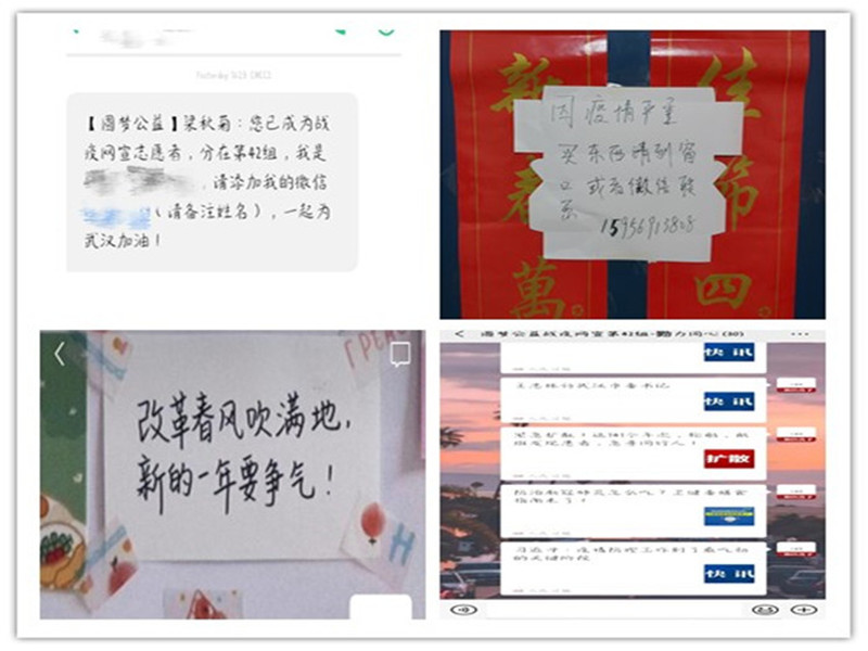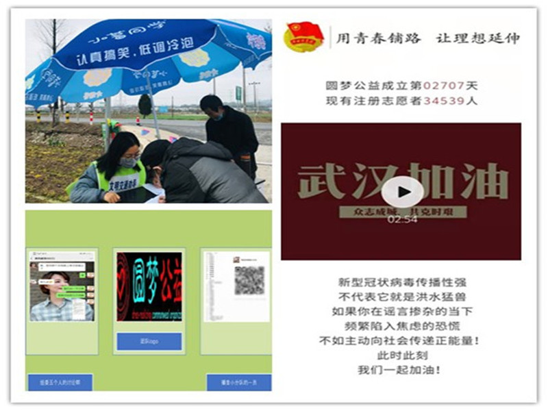 聚是一团火,散是满天星。疫情当前,马院学子通过线上线下各种方式在全国各地发光发热,勇当排头兵。来自安徽省天长市的18级本科生董礼佳在家乡为市民们登记居民出入信息、检查出入证。18政教的江艳表示:“我愿意为疫情防控工作贡献自己微薄的力量,响应村委会的号召与征集,积极参与疫情防控志愿工作。”19级本科生宋欣悦在街道劝导市民尽量减少外出,帮助社区开展疫情防控宣传布置工作。19级本科生韦杨叶在征得家人同意和做好自身防护的基础上,结合实际情况,安全有序地参与开展便民服务,用实际行动助力当地疫情阻击工作。尽管疫情来势汹汹,马院学子都坚定地践行着隔离病毒,但不能隔离爱的宗旨,除了积极参与线下志愿工作之外,还有部分同学成为了线上宣传者,为疫情的宣传防控贡献自己的力量。18级本科生梁秋菊志愿加入南京圆梦公益团队,利用个人媒体平台进行线上疫情宣传,协助制作宣传材料。19级本科生雷霁雯心系武汉,她通过加入圆梦公益团队成为一名线上宣传工作者,为湖北地区尤其是武汉的筹款、筹物做出贡献,并通过线上作品为武汉群众加油鼓劲。