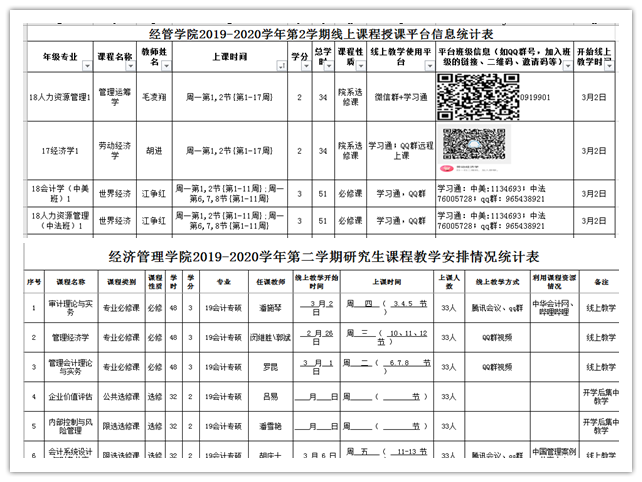 2月17日-3月1日期间,学院共有8门核心通识课程开展线上授课,学院以通识课程的线上教育为契机,积极探索课程教育过程中所存在的问题,主动改进,不断完善。此外,各系部更是通过开展线上教学模拟课程,集中学习线上课程开展要求、分享建课经验、讨论授课模式,确保课程建设有成效、授课形式有创新、课程内容易接受。各位系主任也主动做好系部网络教学的督促与指导工作,帮助年纪较大、网络使用不熟练的老师开展网课建设,保障所有课程均能顺利上线。线上教学对学院所有教师以及学院教学体系建设都是一项创新的挑战,经管学院以“崇德 尚学 笃行 创新”的态度,不断探索,不断完善,在完成本次线上教学目标的同时,不断拓展学院教学育人途径。